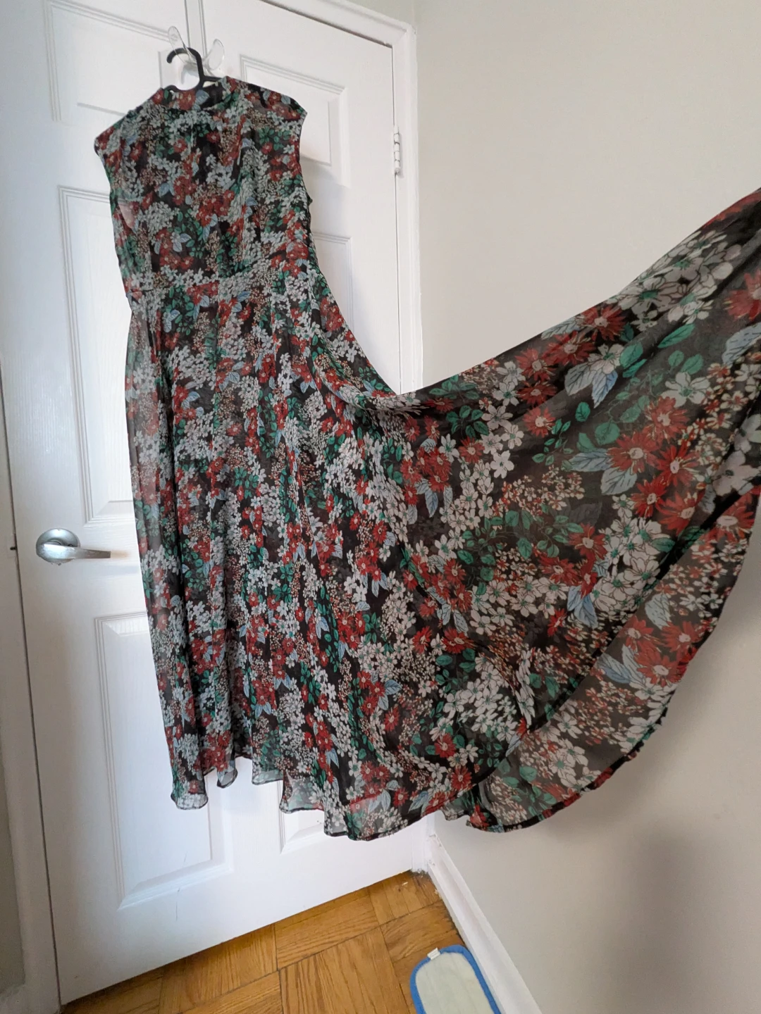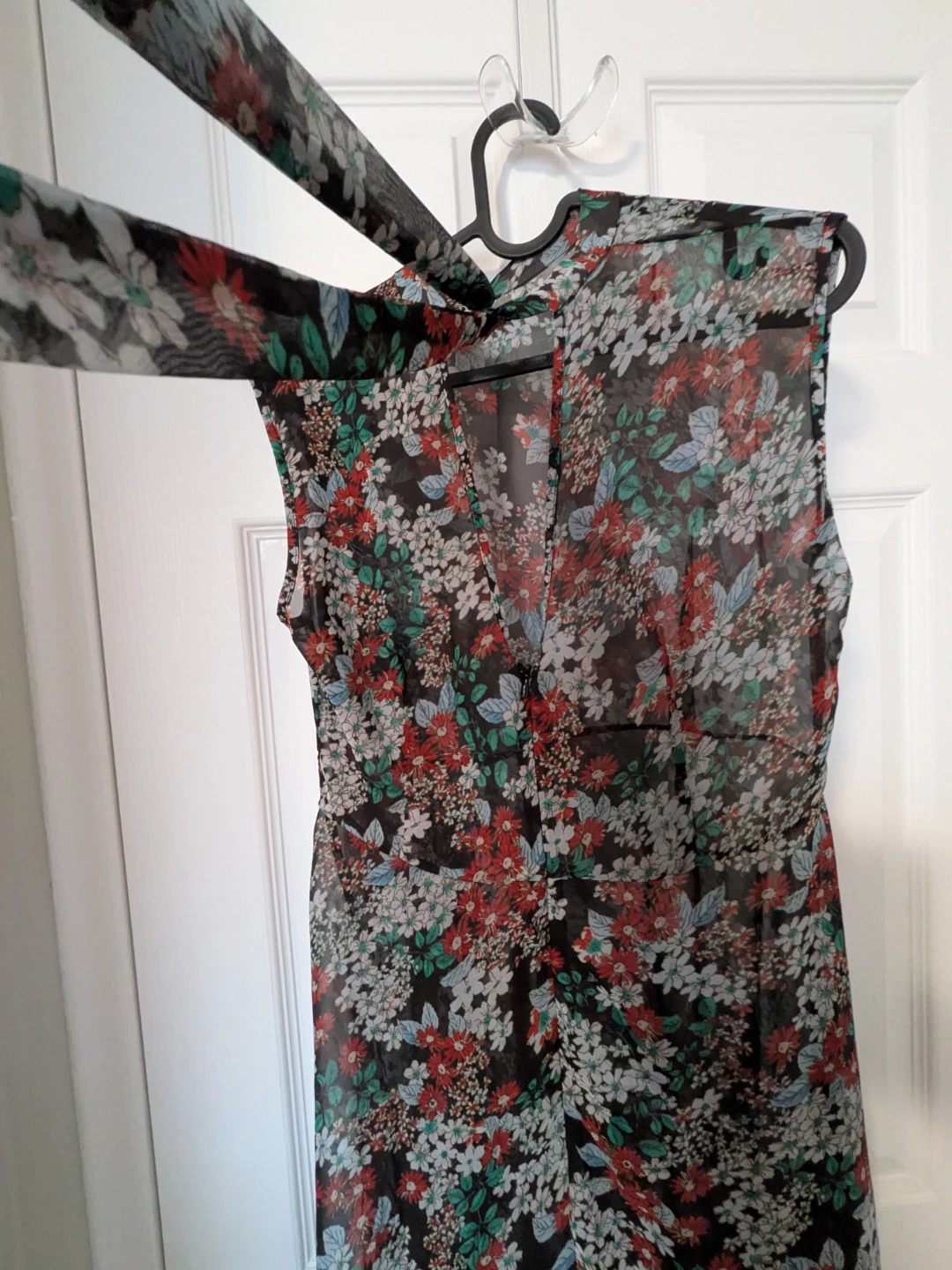 Beautiful floral maxi dress, perfect for summer days or evenings out! The dress is lightweight and flowy, making it super comfortable to wear. It features a lovely floral pattern in shades of red, white, green, and blue on a dark background. It's in great condition and ready for a new home!