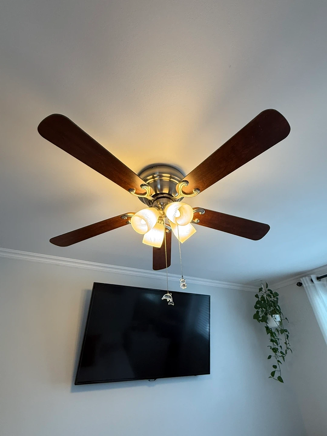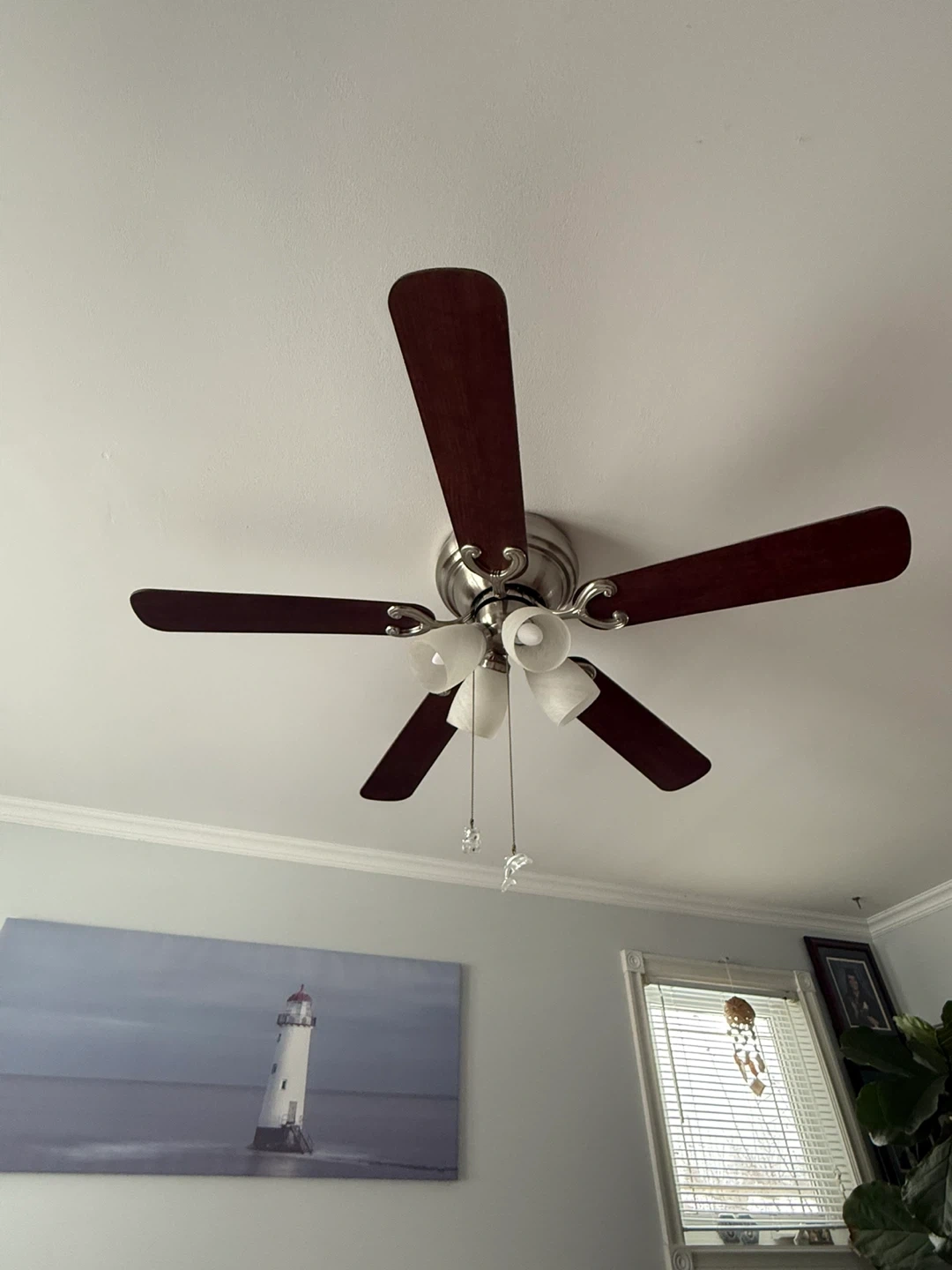 Five-blade ceiling fan with lights. Wood-look blades and brushed nickel finish. Includes pull chains for fan and light control.