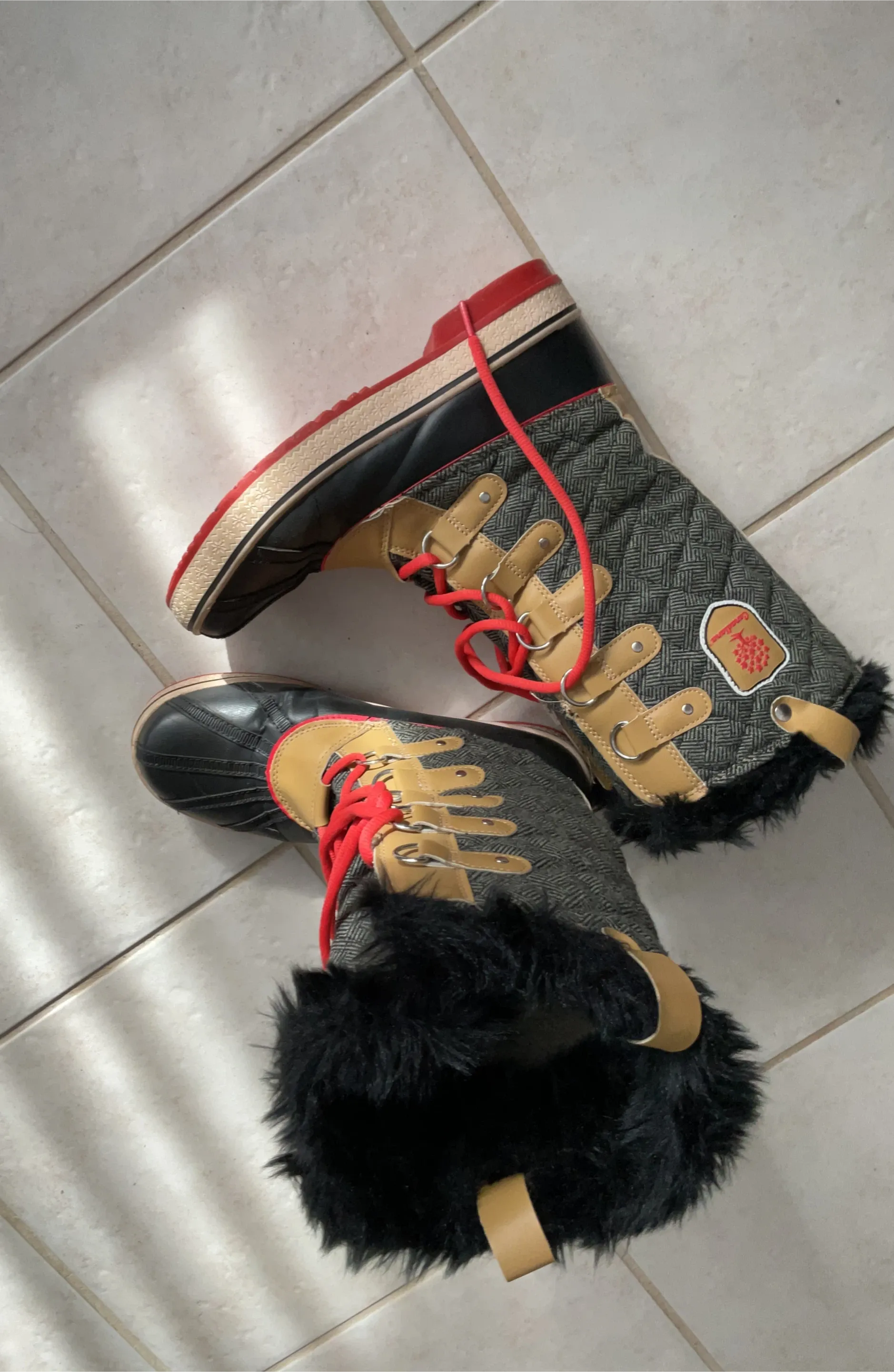 Black and grey quilted winter boots with red laces and black faux fur trim. Leather accents and rubber soles. Great for keeping your feet warm and dry!