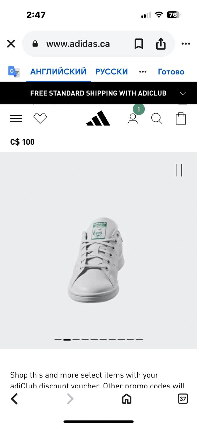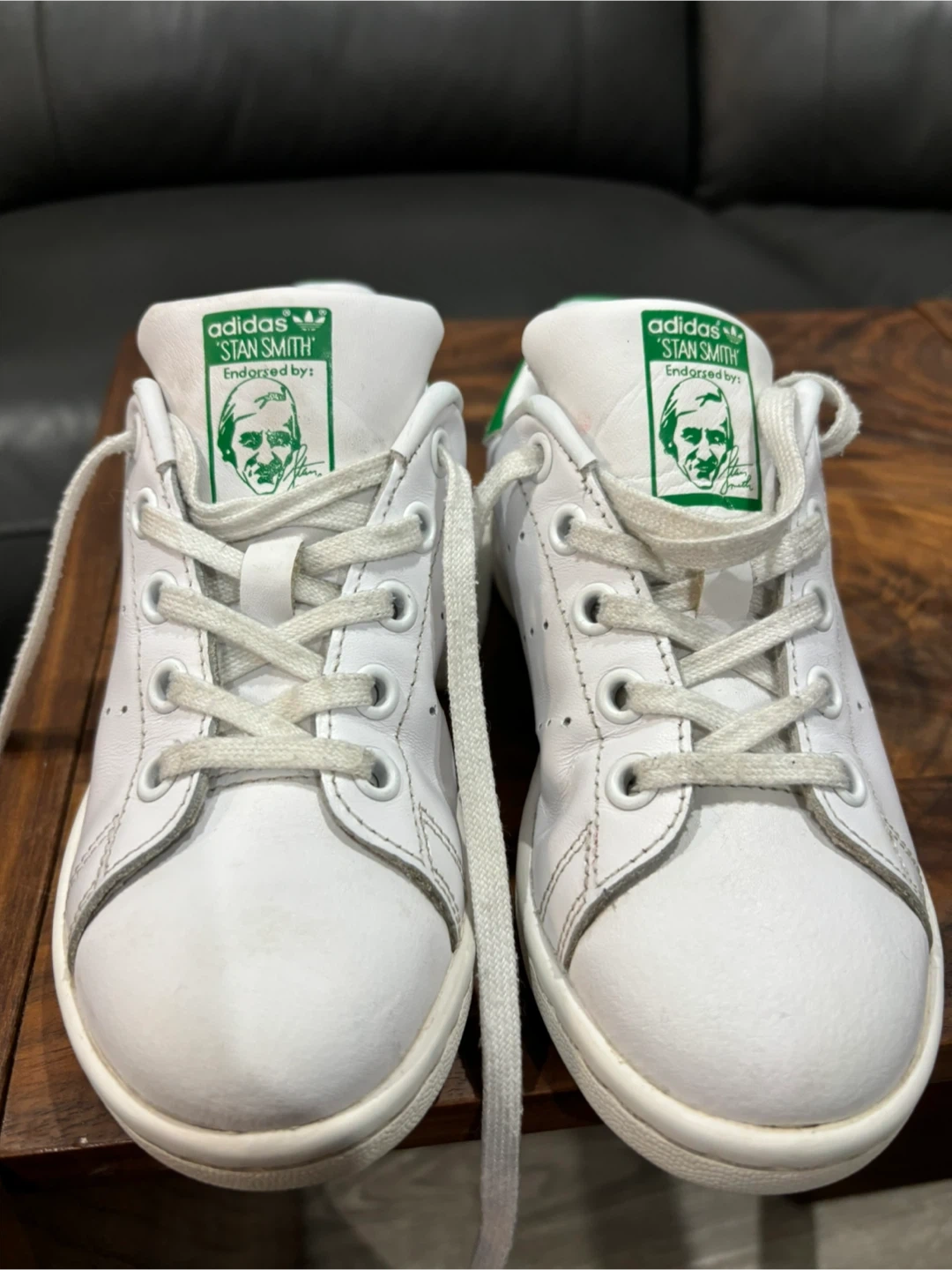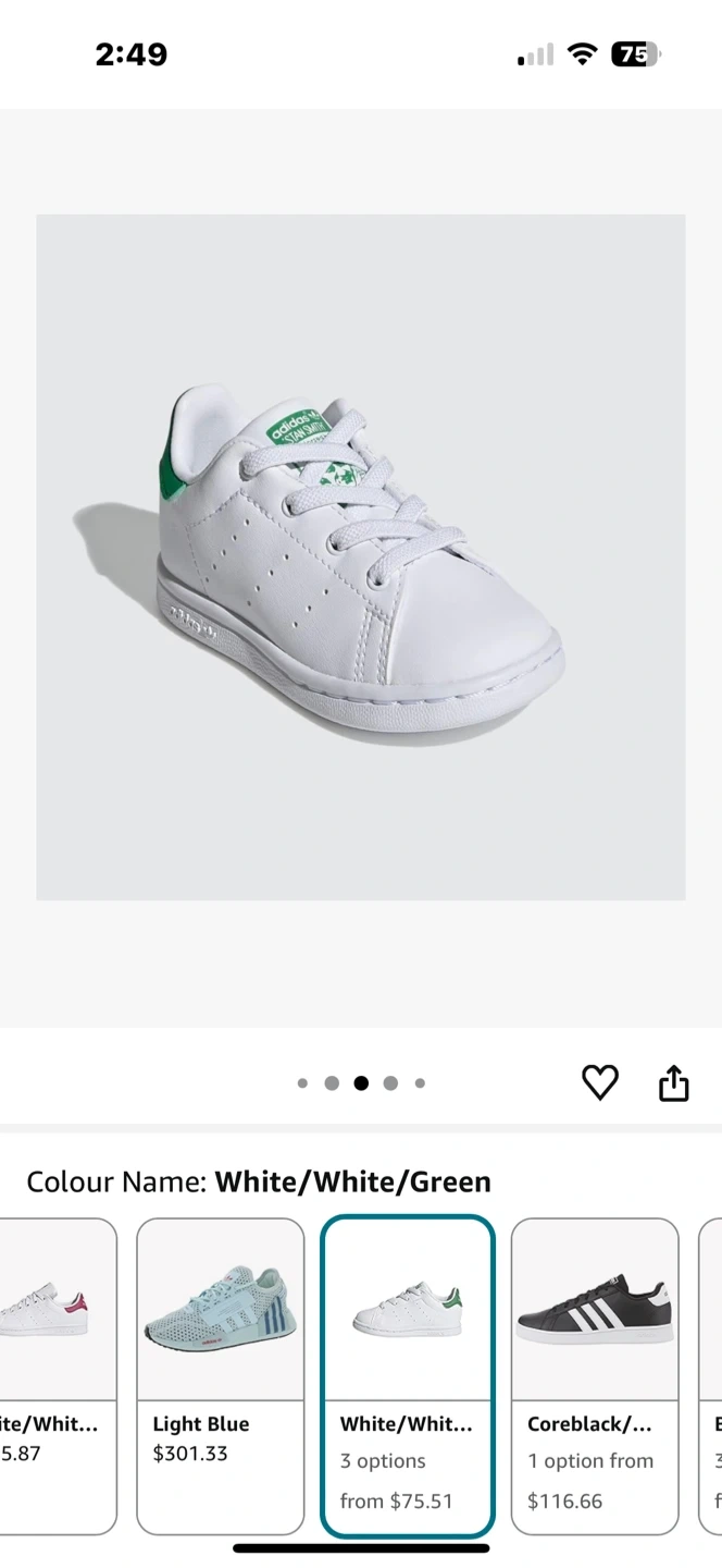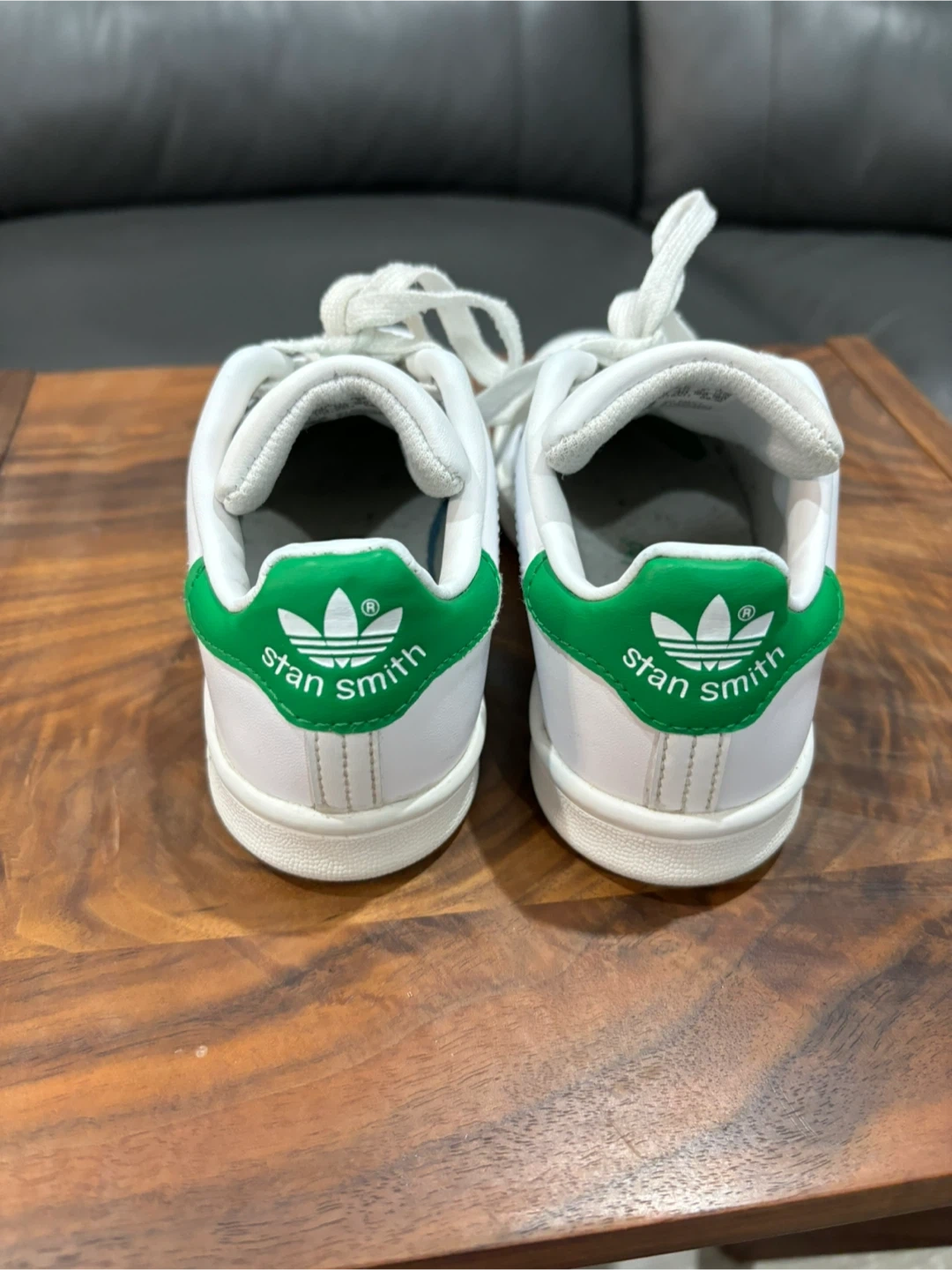 Selling a pair of Adidas Stan Smith sneakers for toddlers in size 11. The shoes are white with green accents. Size is US 12K, UK 11 1/2K, FR 30, CHN 180. Perfect for your little one!