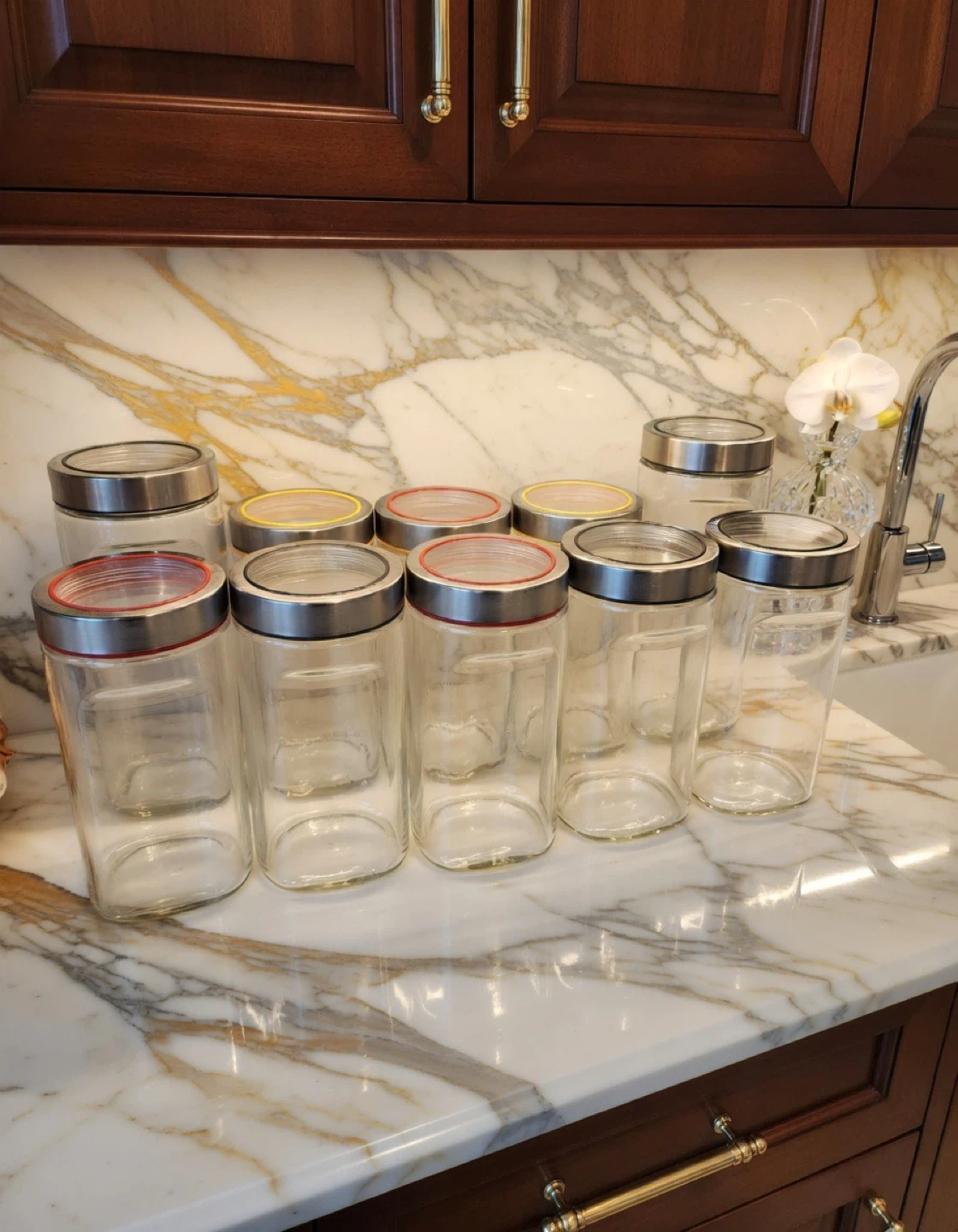 10 glass canisters jars with metal lids for kitchen storage. Some lids have coloured accents. These are great for organizing spices, grains, daals, pasta, or other dry goods.