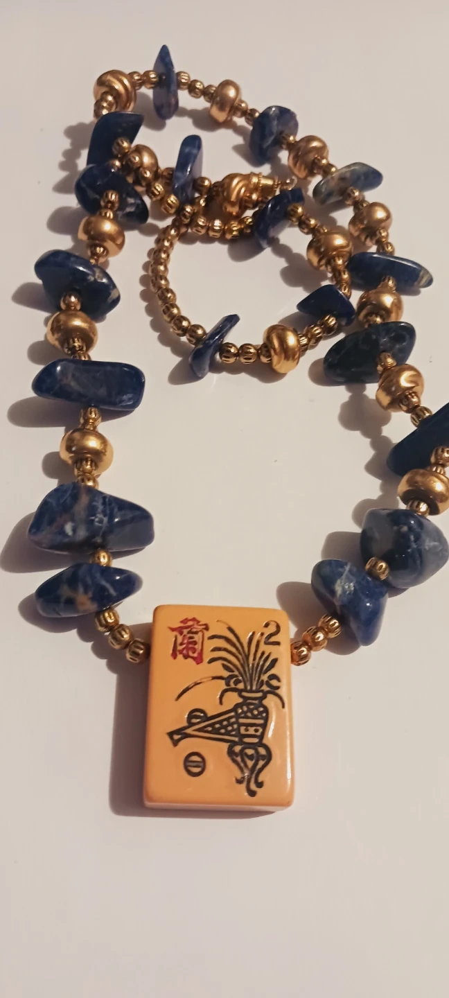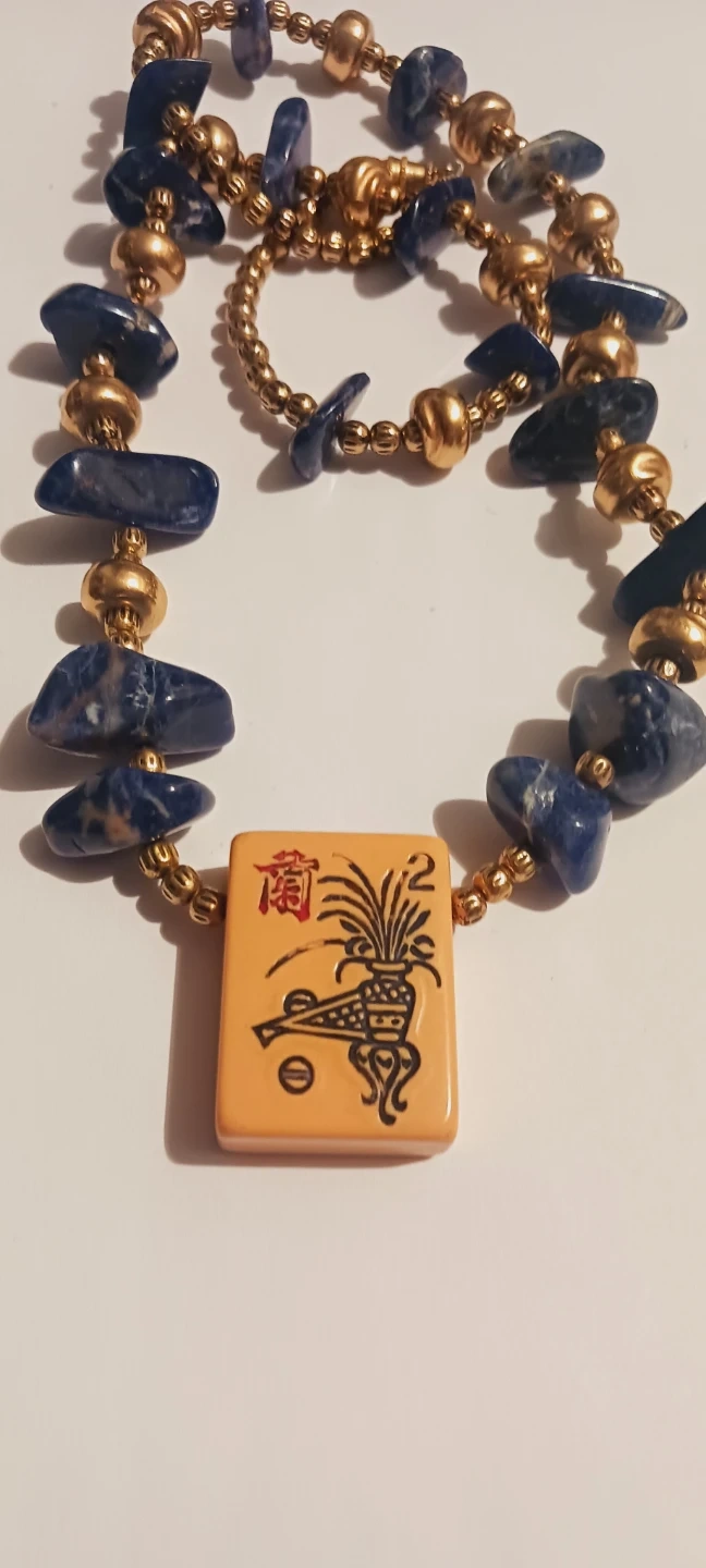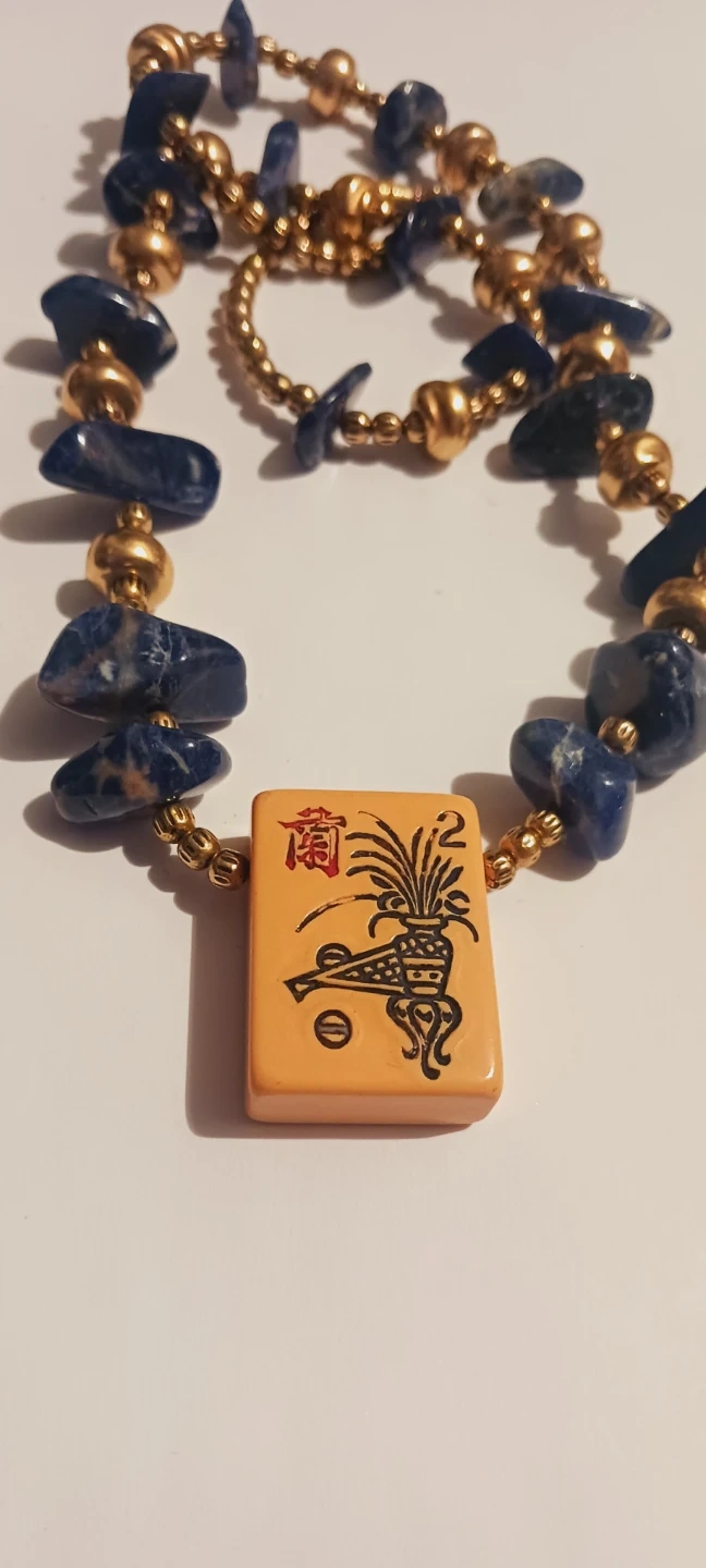 Asian Mahjong Tile Pendant blue stone gold tone beaded necklace