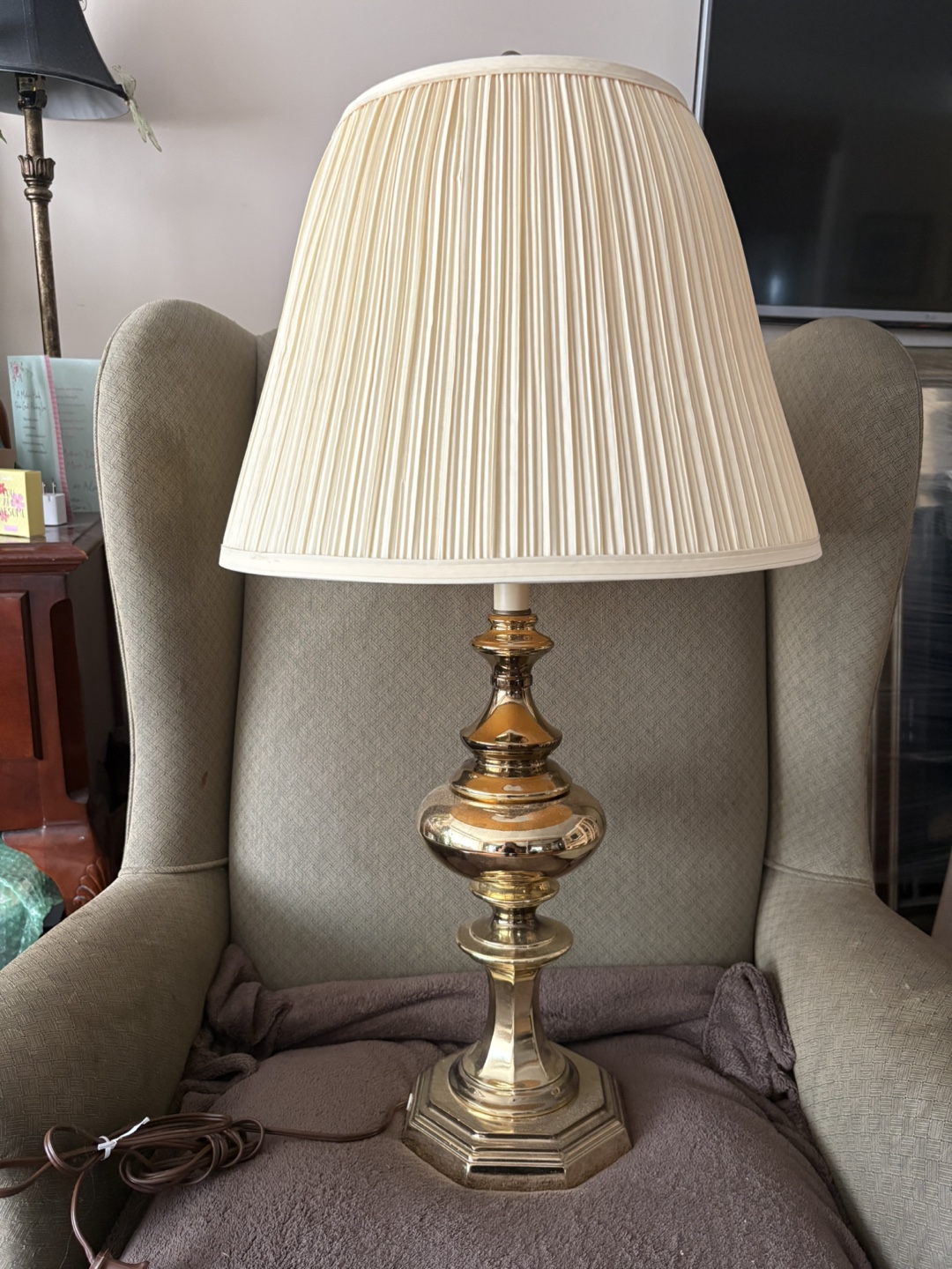 Selling a lovely gold-toned table lamp! It features a classic design with a pleated, off-white shade. It would look great in a living room or bedroom