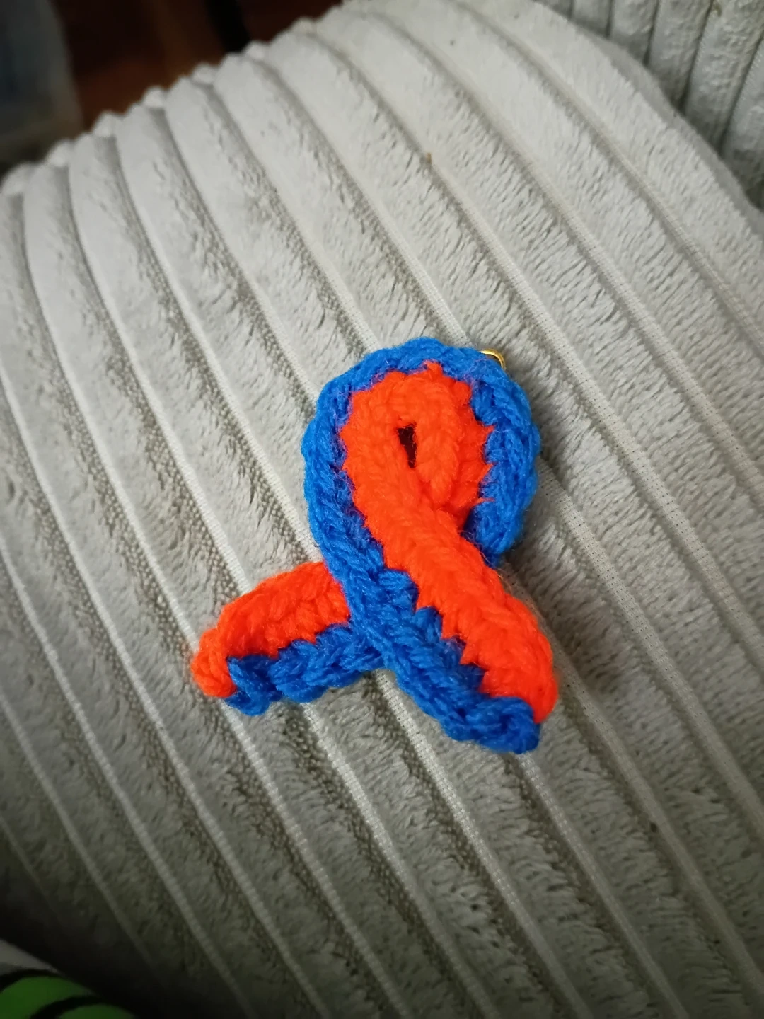 This is a handmade crochet ribbon pin with blue and orange colours. It's attached with a safety pin, ready to be worn. It's great for showing support or raising awareness for Functional Neurological Disorder. April is FND Awareness month. I have crocheted these ribbons to fundraise for FND Hope, fndhope.org.