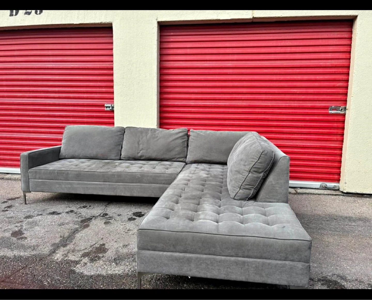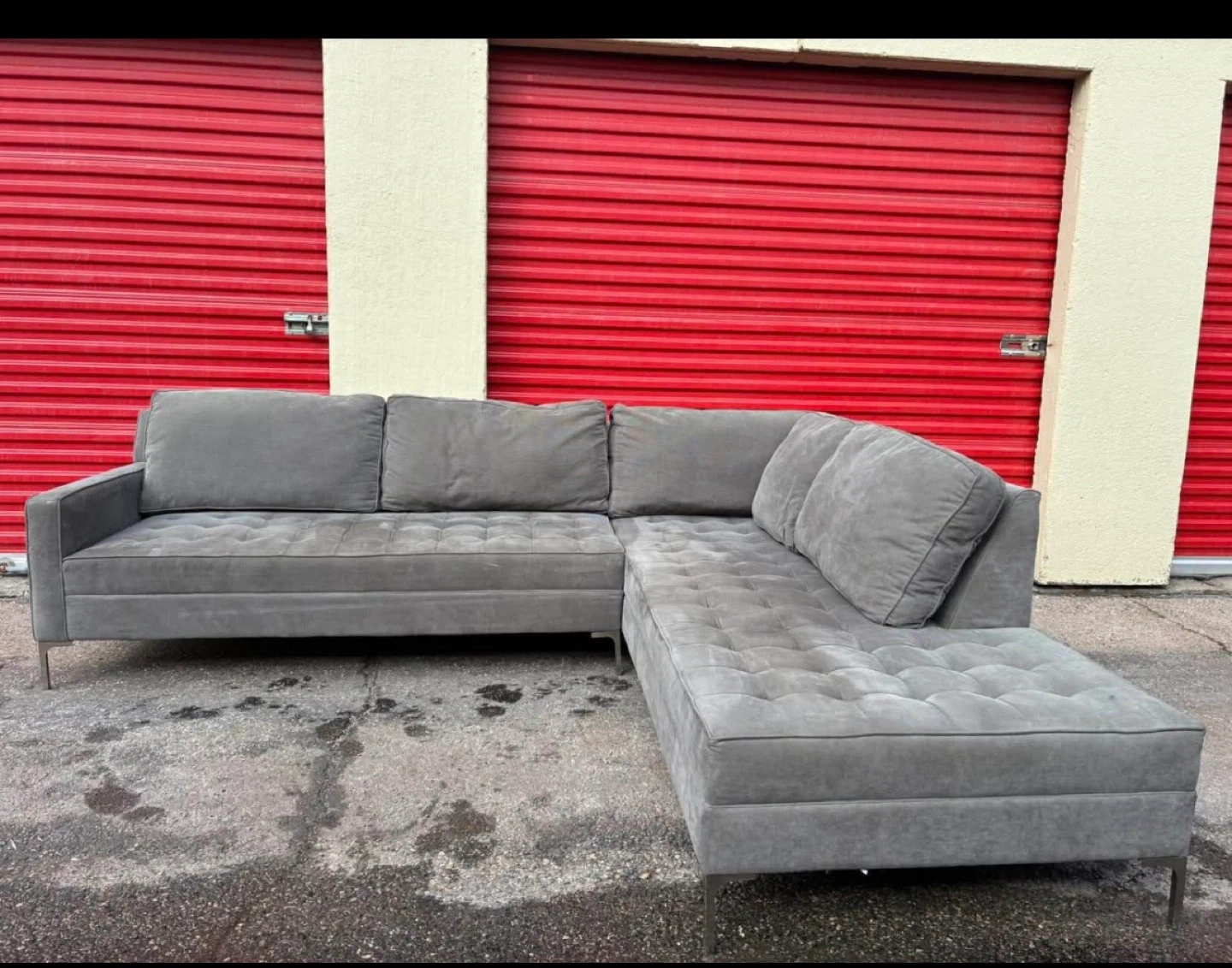 Tufted grey sectional sofa with a chaise. Measures 106" wide and 37" deep, with a height of 35". Selling because it doesn’t fit my apartment