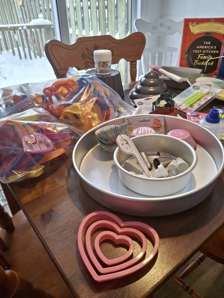 For sale is this baking/cake/cookie decorating lot. Great for a beginner! Lot includes MANY cookie/fondant cutters in metal & plastic. Wilton cake pans in 8" square, 6" round, 12" round, jumbo cupcake & heart. Wilton fondant smoother, cake lifter, crimping tool, decorating tips, cake leveler, cake boards. Plastic turntable. Various cupcake liners. 2 Wilton cake decorating books that are extremely helpful and filled with tons of information. Also includes 2 very extensive cookbooks. $150 for the lot, price is firm.