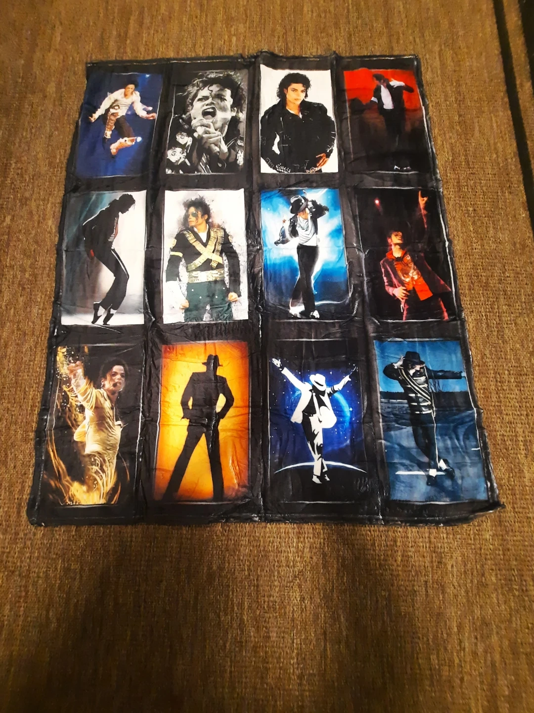 This blanket features a collage of Michael Jackson's iconic poses and images across twelve panels. It's made of a soft material, perfect for any fan.48 x 40 inches. Brand new
