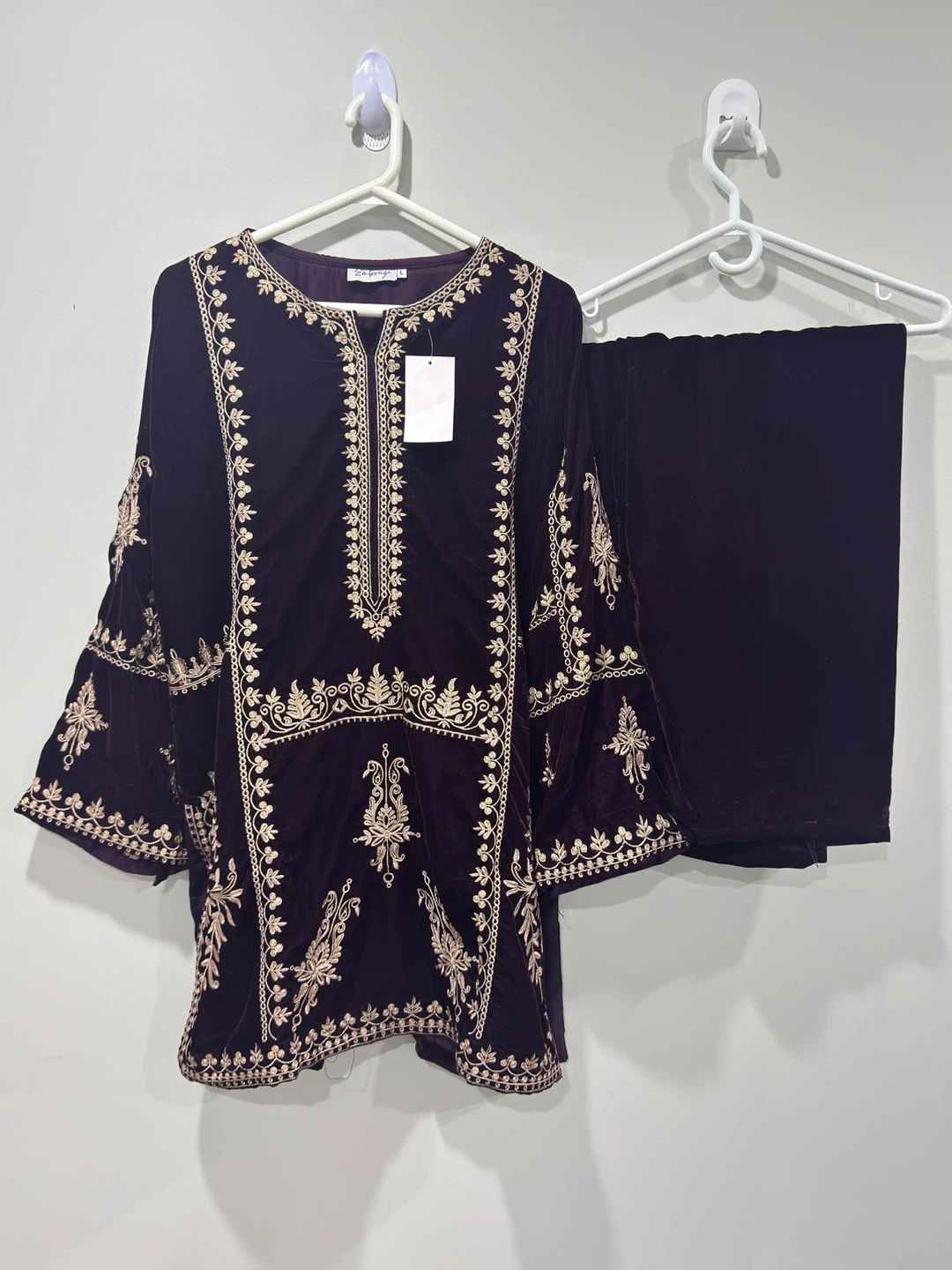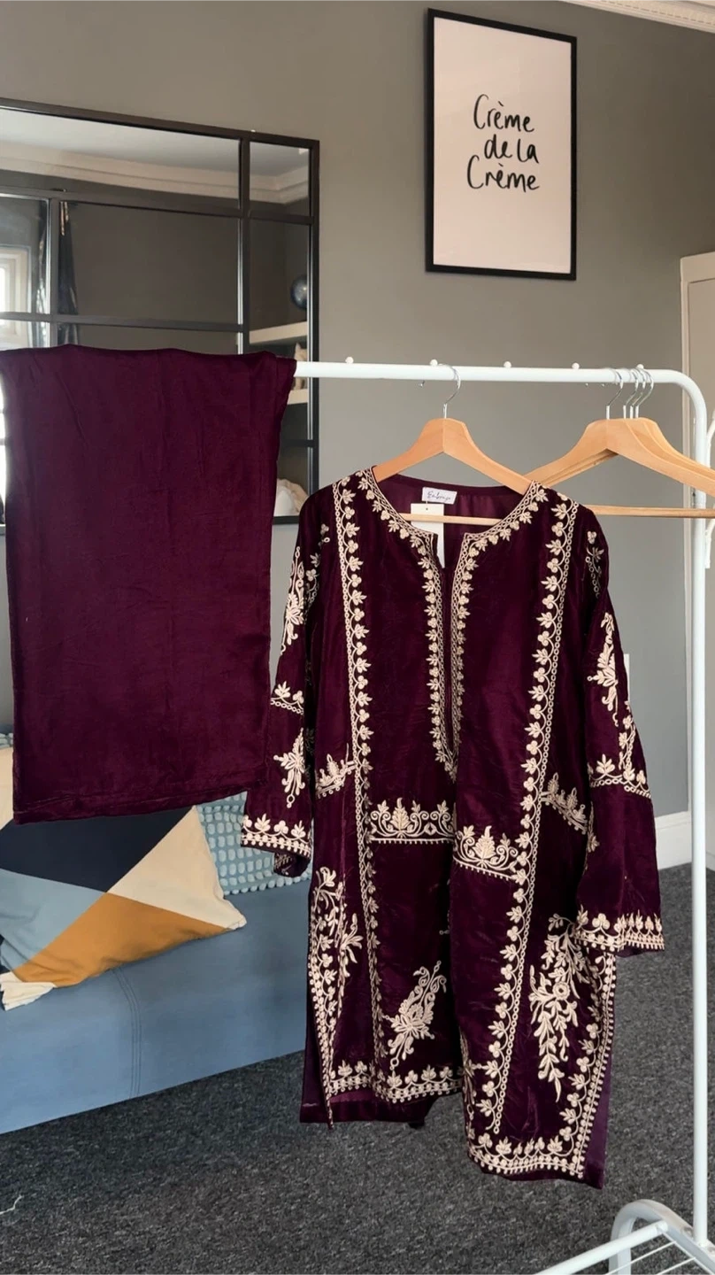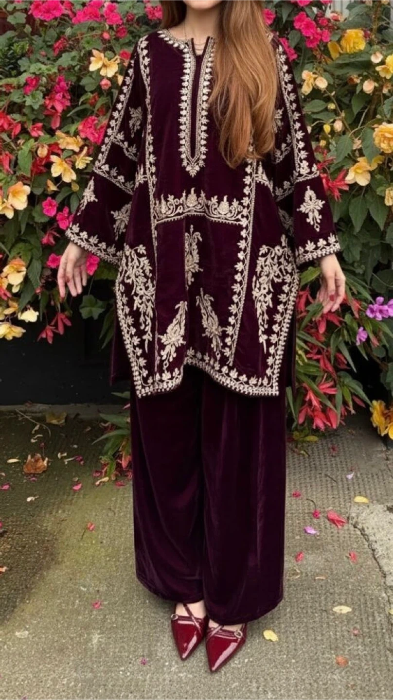 A beautiful velvet brown short kurti with pant with nice embroidery, elegant, stylish and great for occasions.