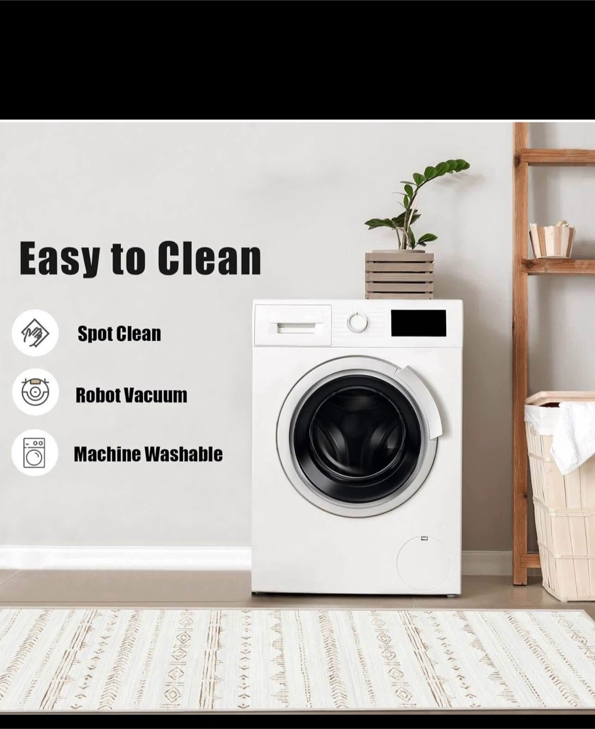 23New This area rug is perfect for adding a touch of style to any room. It features a soft surface and low pile, making it ideal for high-traffic areas. It's also easy to clean, with options for spot cleaning, robot vacuuming, or machine washing. The rug has a durable edge and non-slip backing for added safety and longevity