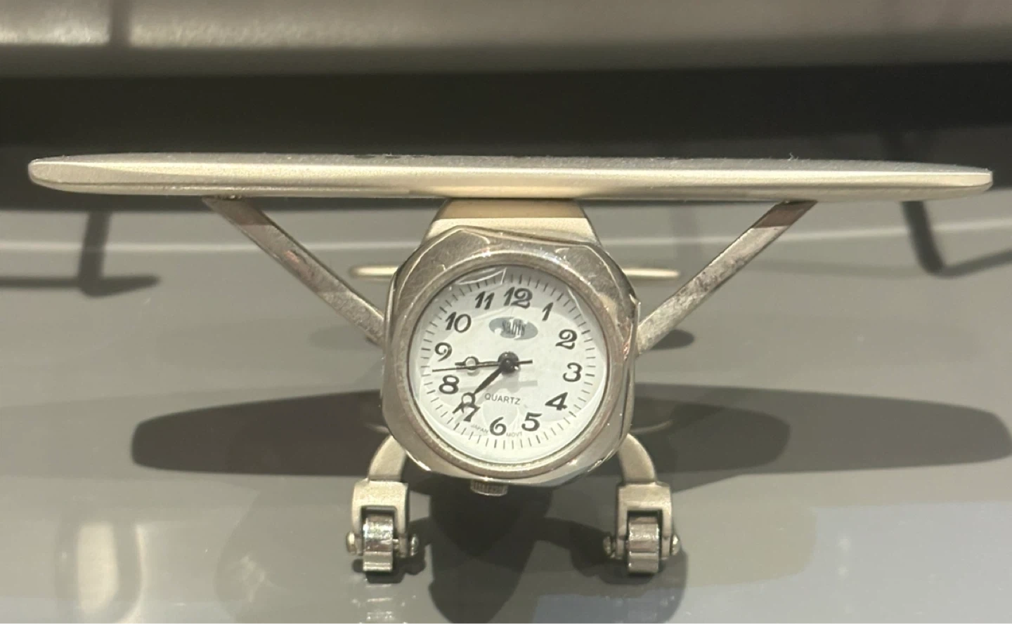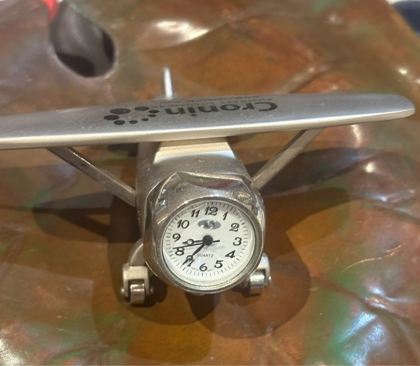 This is a novelty desk clock shaped like an airplane. It features a quartz movement and a silver-tone finish. It's a fun piece for any desk! Was from a Tradeshow gift - needs a new battery