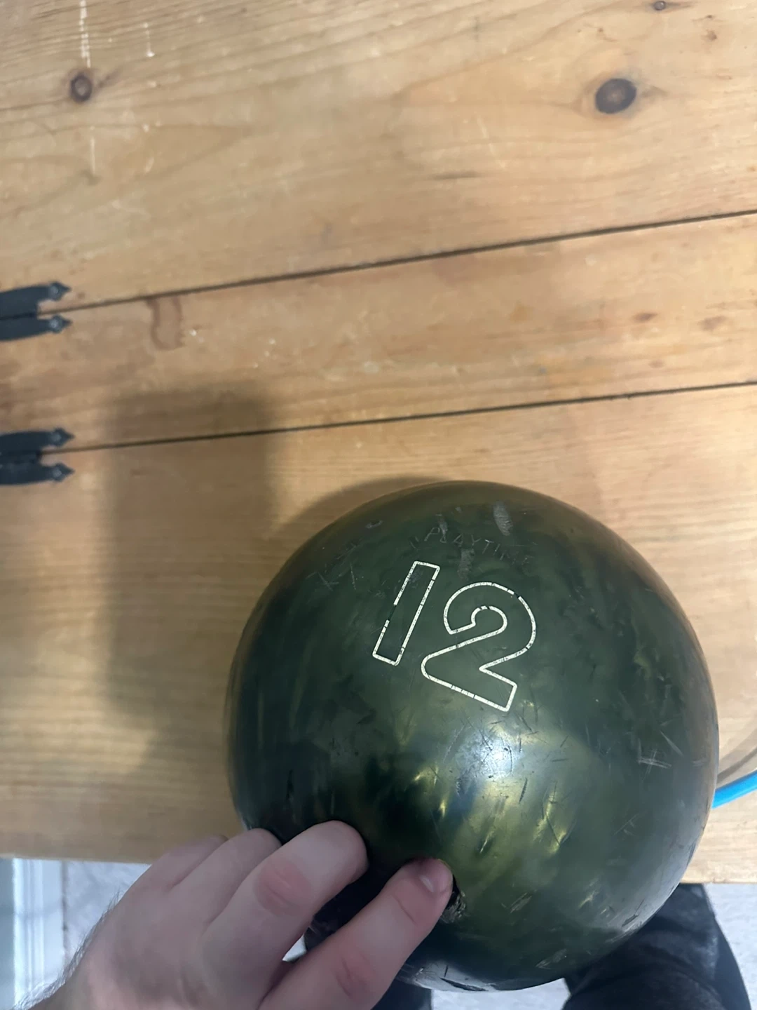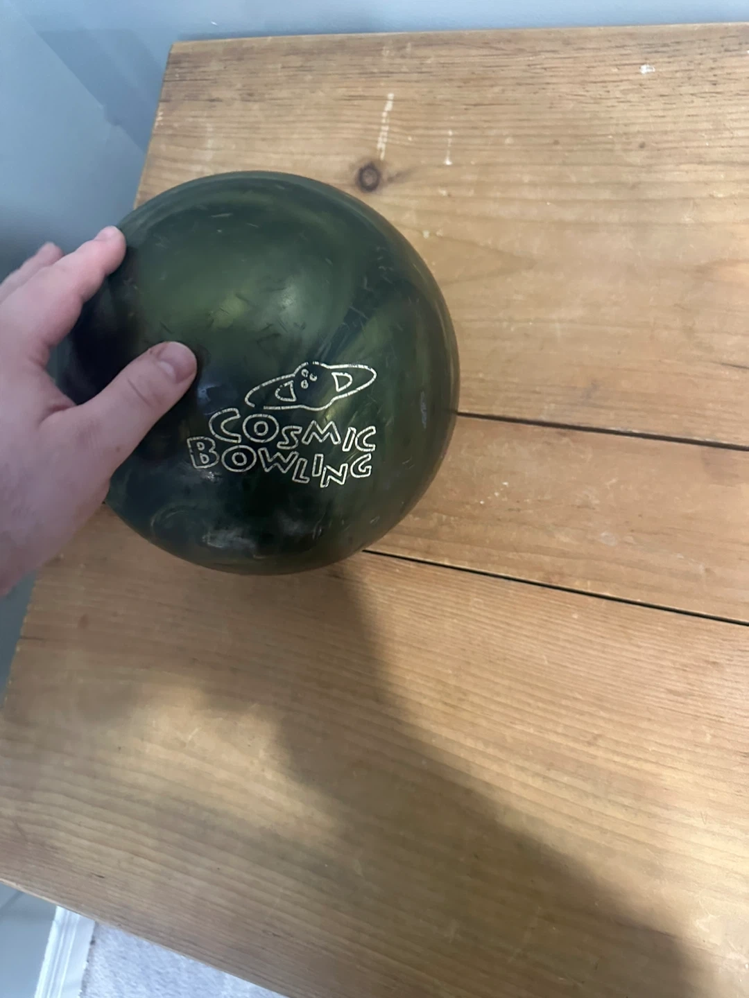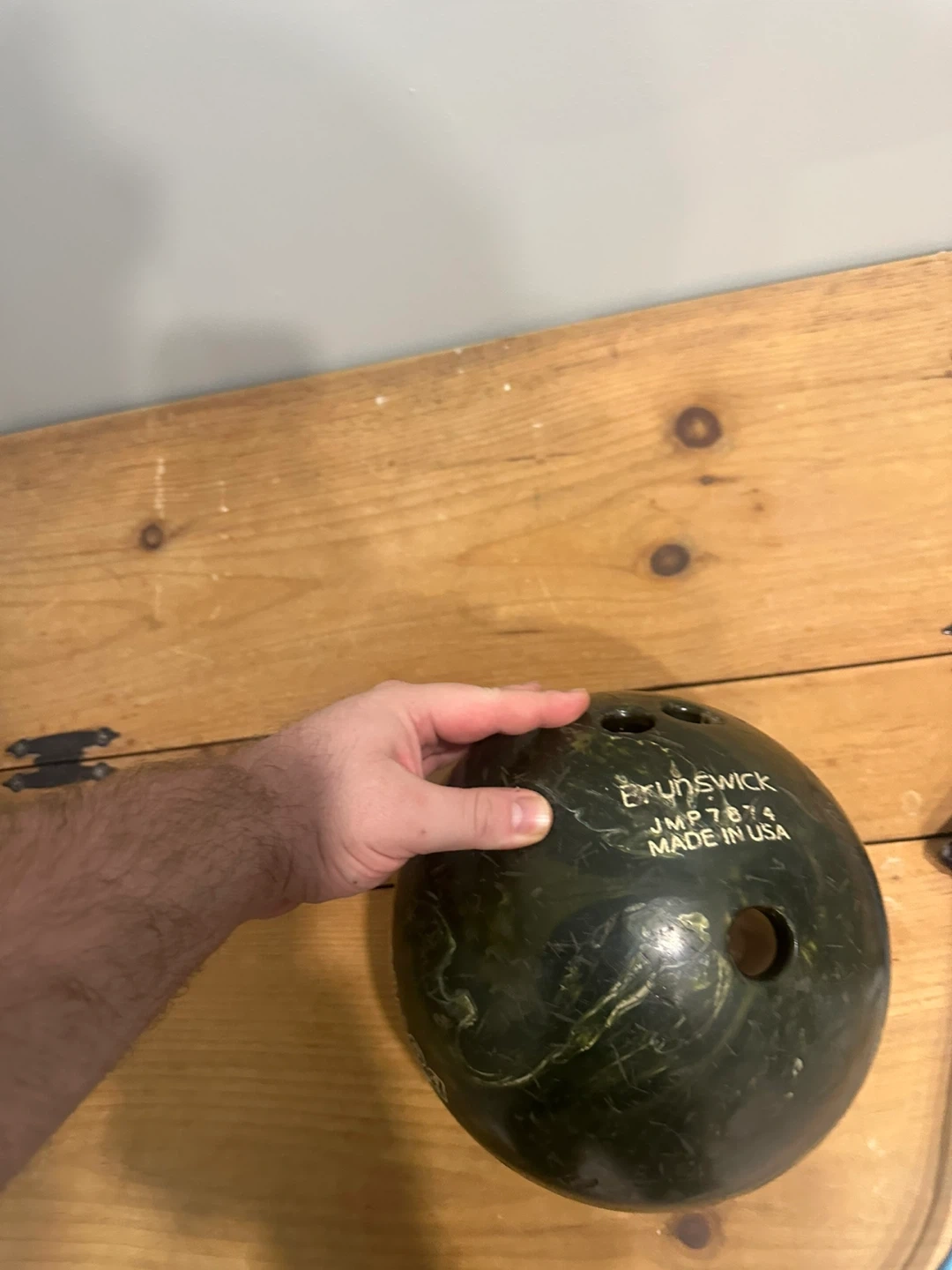 Brunswick Cosmic Bowling JMP 7074 bowling ball. It's a 12 lb ball with a distinctive dark green swirled design. Made in USA. This ball is suitable for bowlers looking for a reliable option.