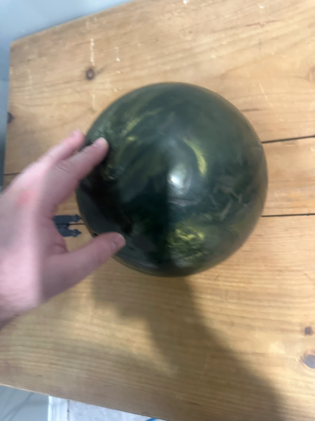 Brunswick Cosmic Bowling JMP 7074 bowling ball. It's a 12 lb ball with a distinctive dark green swirled design. Made in USA. This ball is suitable for bowlers looking for a reliable option.
