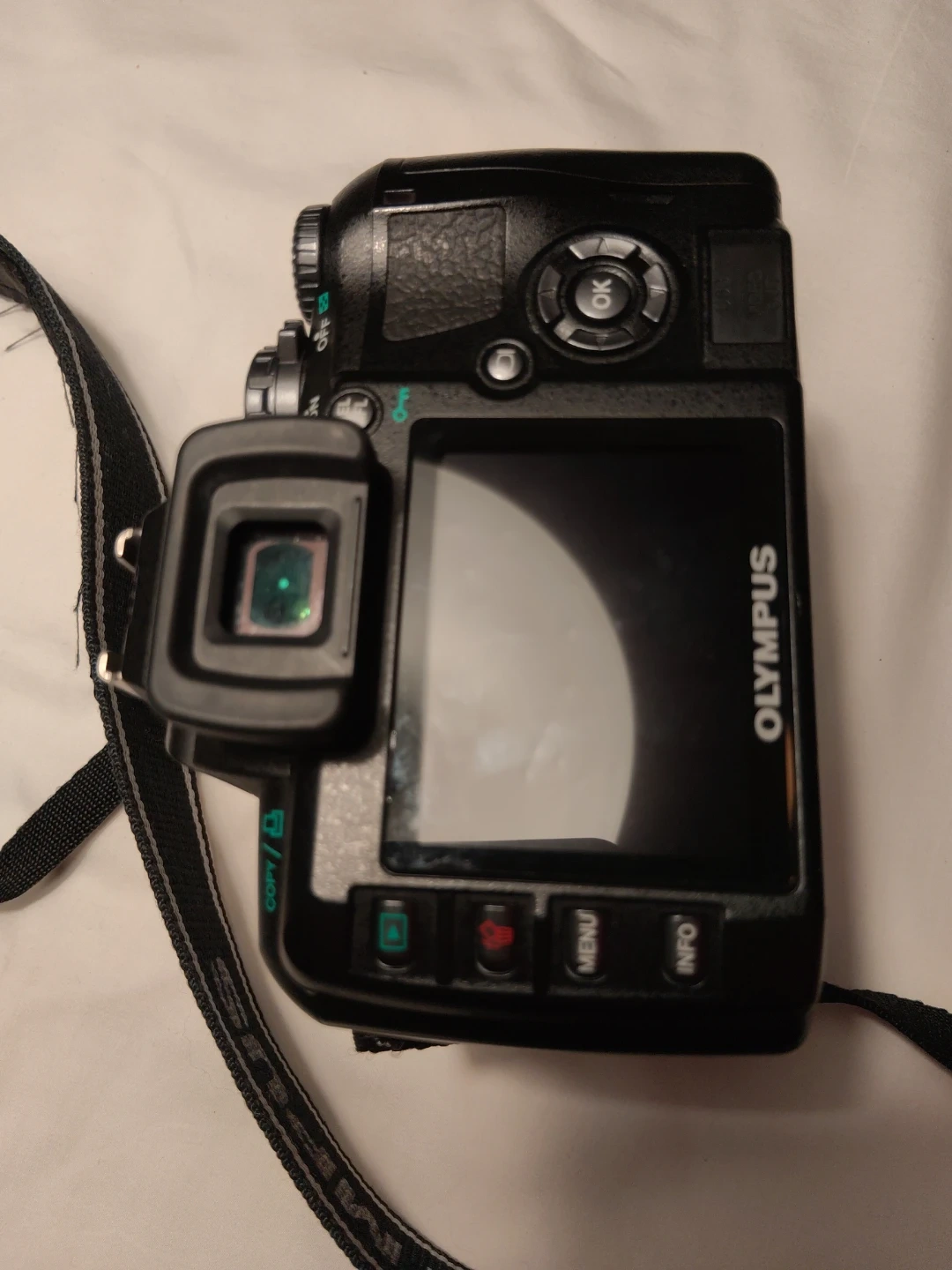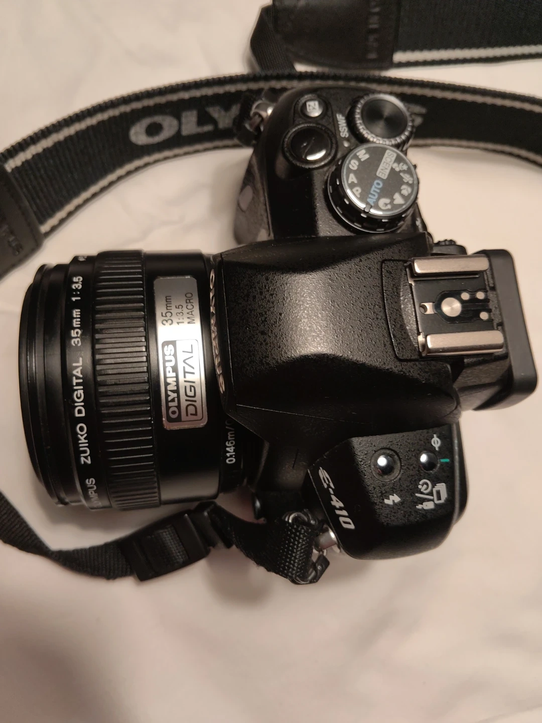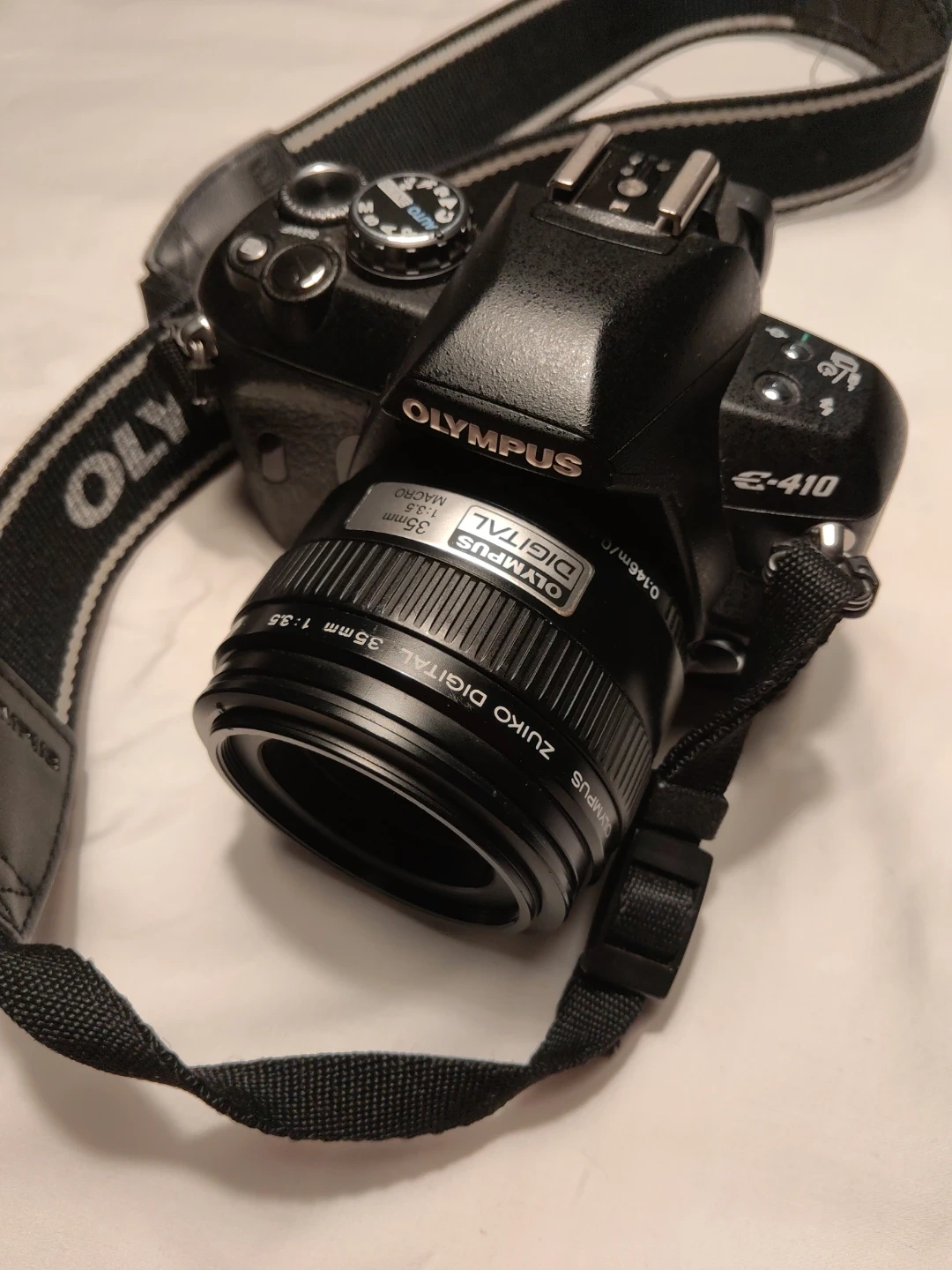 Olympus E-410 digital camera. It's black and comes with a Zuiko Digital 35mm 1:3.5 Macro lens and an Olympus Li-ion battery. This camera is great for capturing detailed close-up shots!