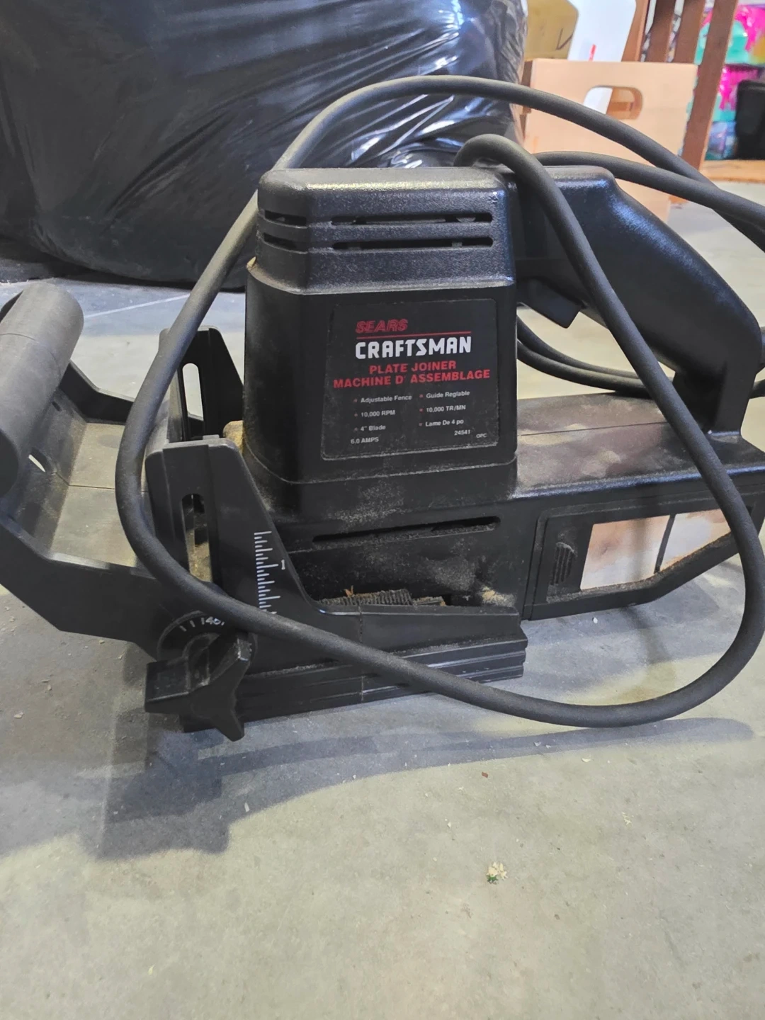 This Craftsman plate joiner machine has an adjustable fence and guide. It operates at 10,000 RPM with a 4" blade and 6.0 amps. It's great for woodworking projects needing precise joints.