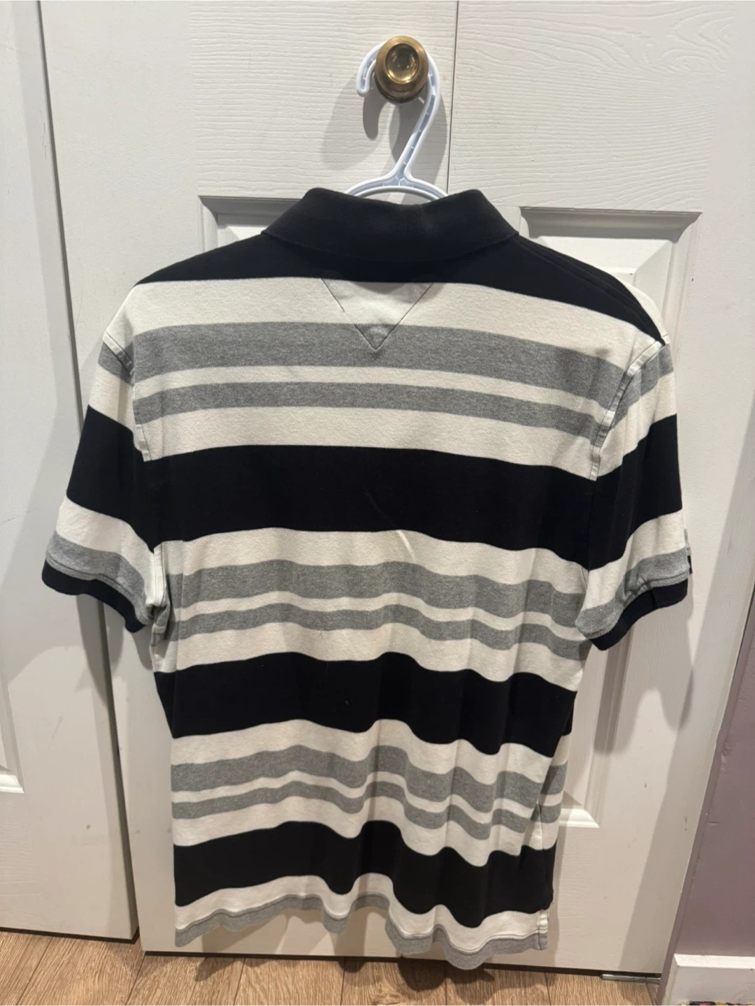 Worn once , practically new, high-quality material, very soft, and authentic. Tommy Hilfiger short-sleeve polo shirt with a black, white, and grey stripe pattern. It's made of a comfortable cotton blend. Classic collar with button placket.