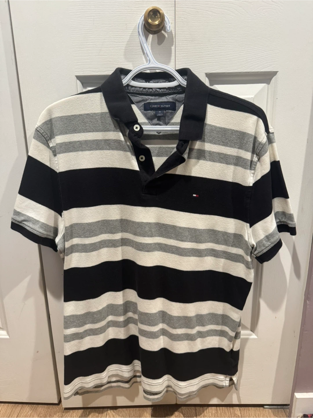 Worn once , practically new, high-quality material, very soft, and authentic. Tommy Hilfiger short-sleeve polo shirt with a black, white, and grey stripe pattern. It's made of a comfortable cotton blend. Classic collar with button placket.