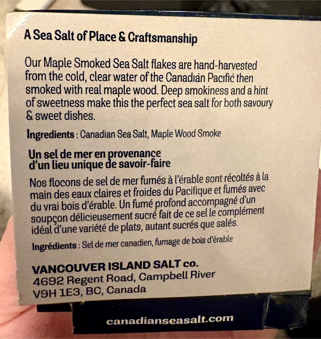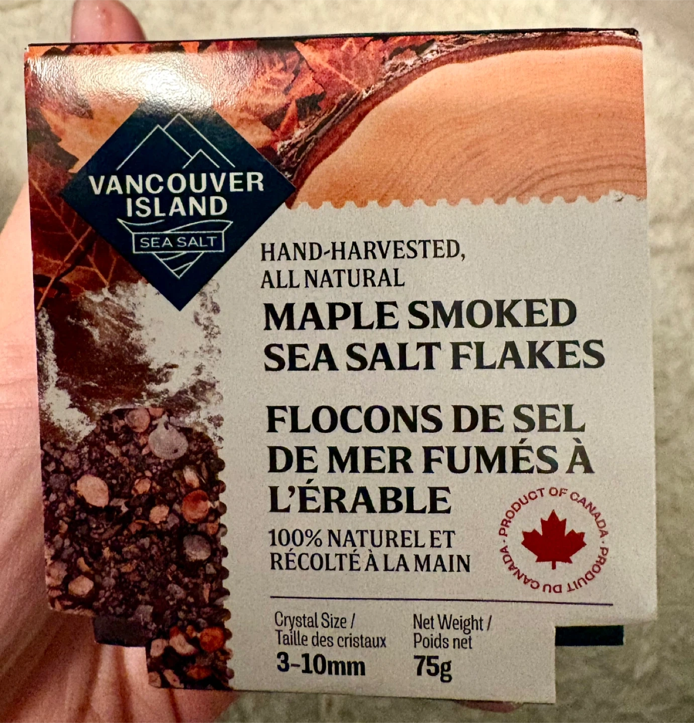 Maple Smoked Sea Salt flakes are hand-harvested from the clear waters of the Canadian Pacific, then smoked with real maple wood. It's hand-harvested and all-natural. Crystal size is 3-10mm.