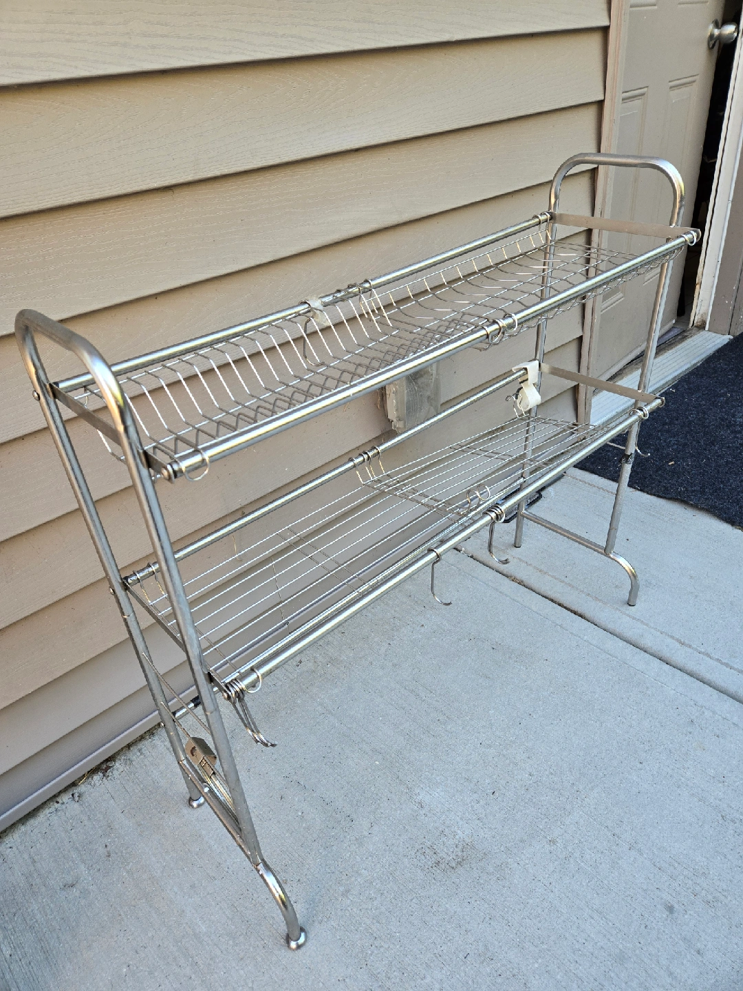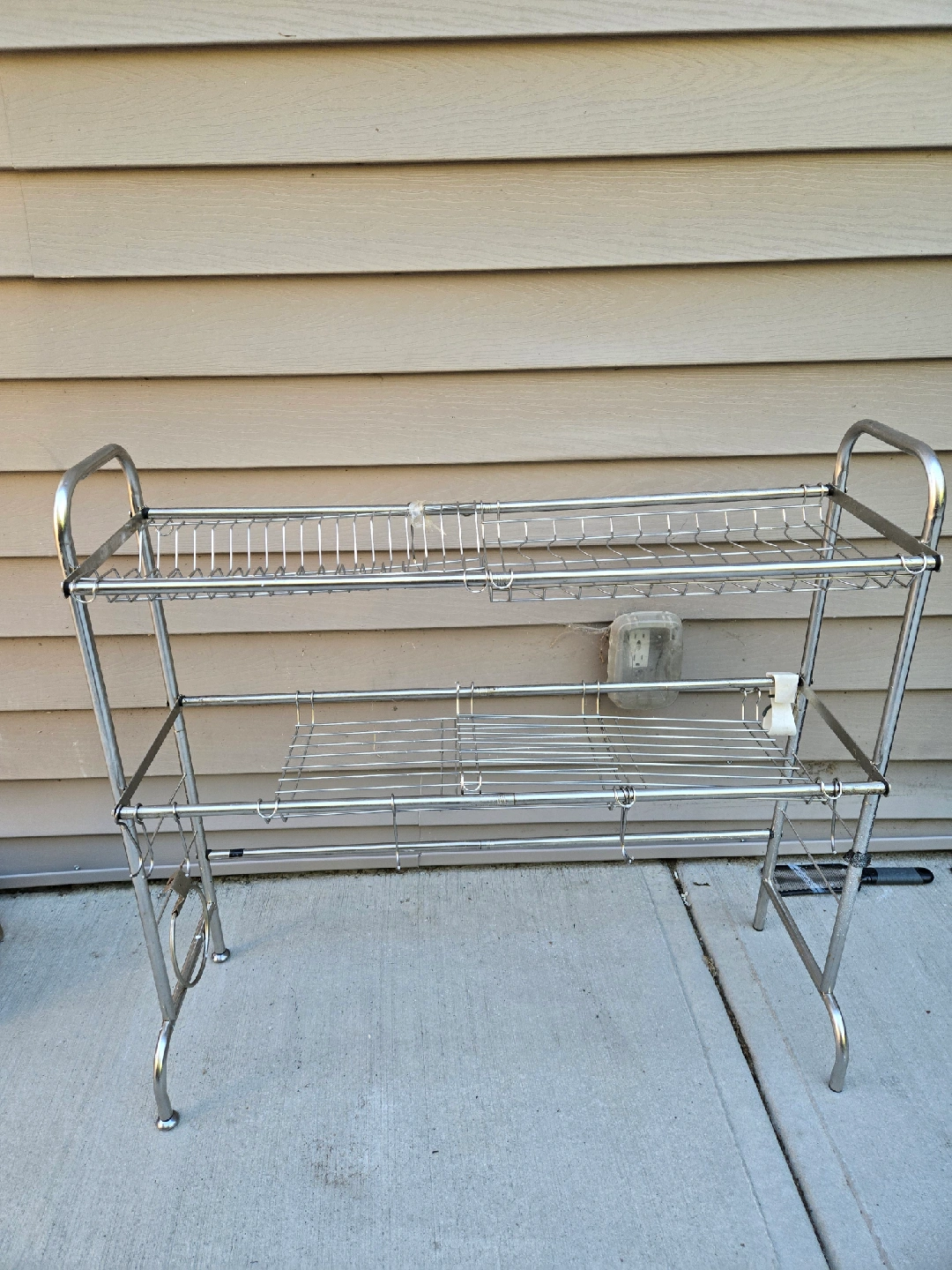 Selling a vintage chrome dish rack. It's a great way to organize your dishes after washing. This dish rack has two tiers and some hooks on the side for hanging items. It is in used condition.