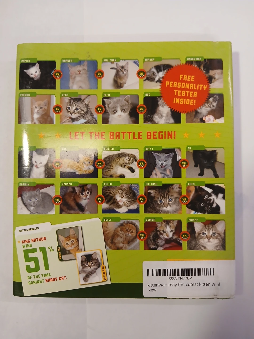This book features a "Kittenwar" where you can determine the cutest kitten. It includes a free personality tester inside. Learn about various kittens like King Arthur and Shady Cat.