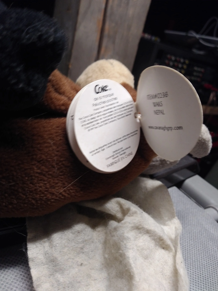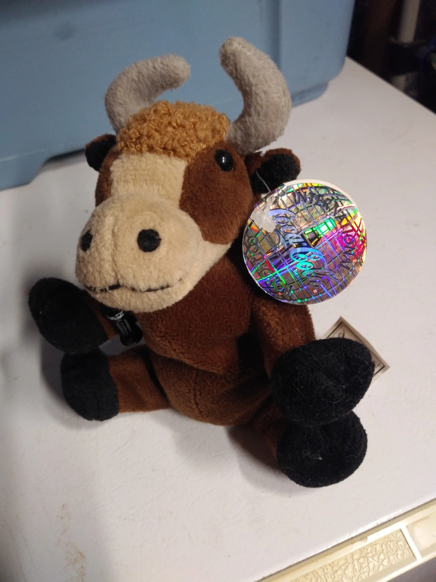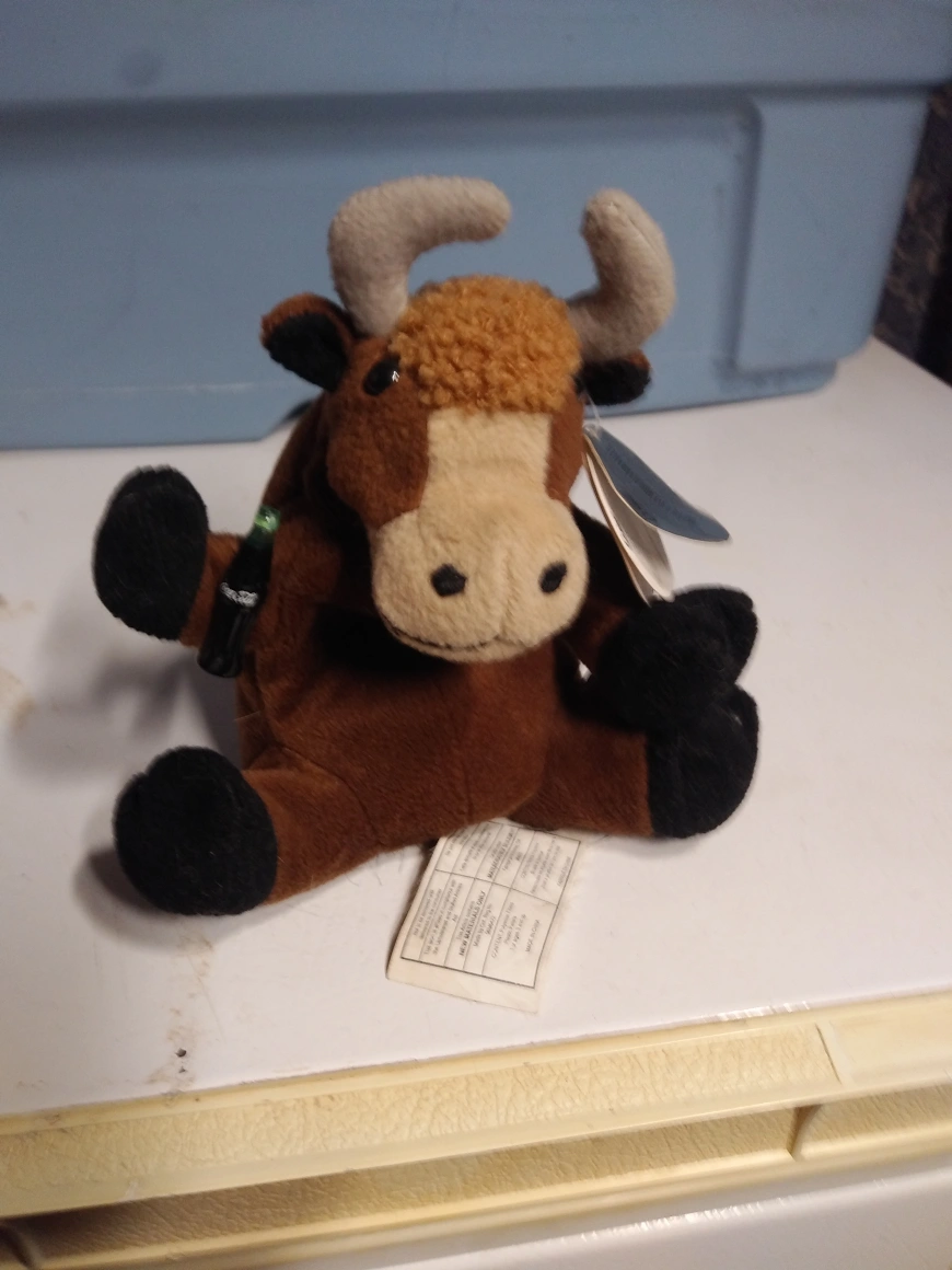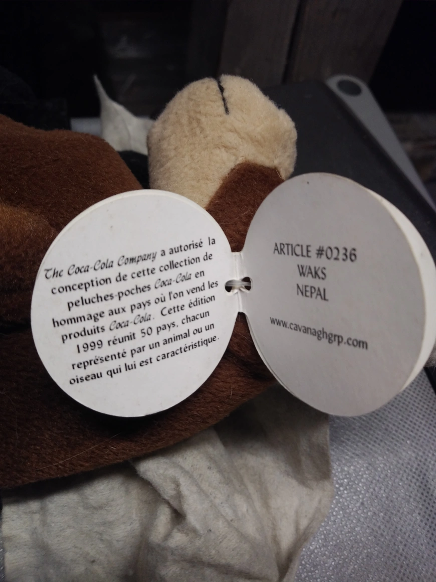 Adorable Coca-Cola plush toy. Brown gaur with grey horns. Small size, collectible item. Part of a 50-country collection. Features a tag with details and item number 0236.