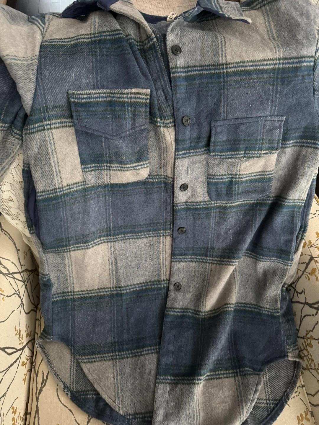 This is a BiBija plaid long sleeve shirt. It has a collared neckline and button-up closure with two front pockets. The material is soft and appears to be a blend suitable for layering.