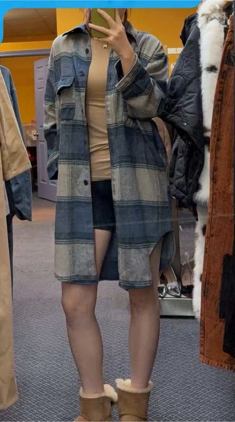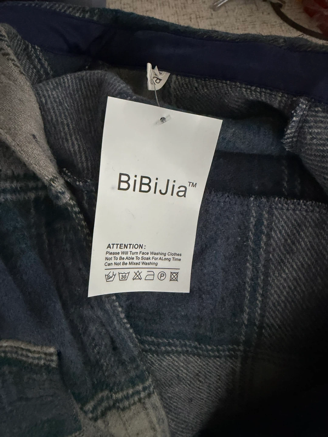 This is a BiBija plaid long sleeve shirt. It has a collared neckline and button-up closure with two front pockets. The material is soft and appears to be a blend suitable for layering.