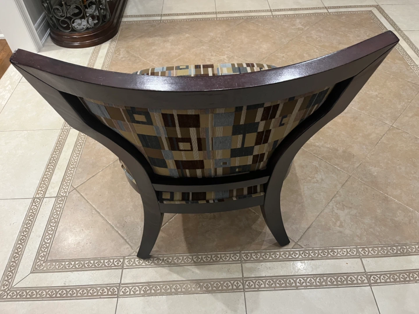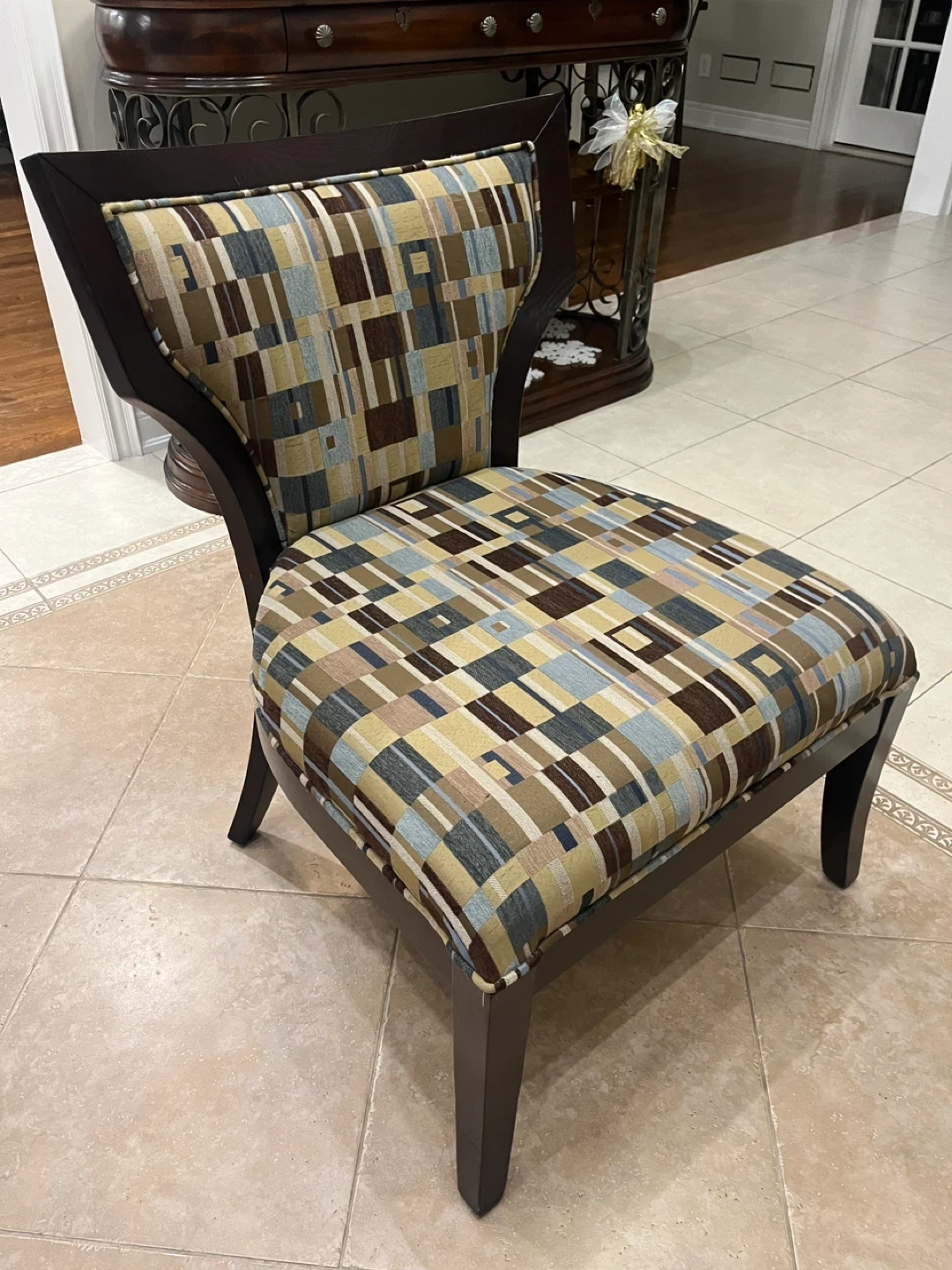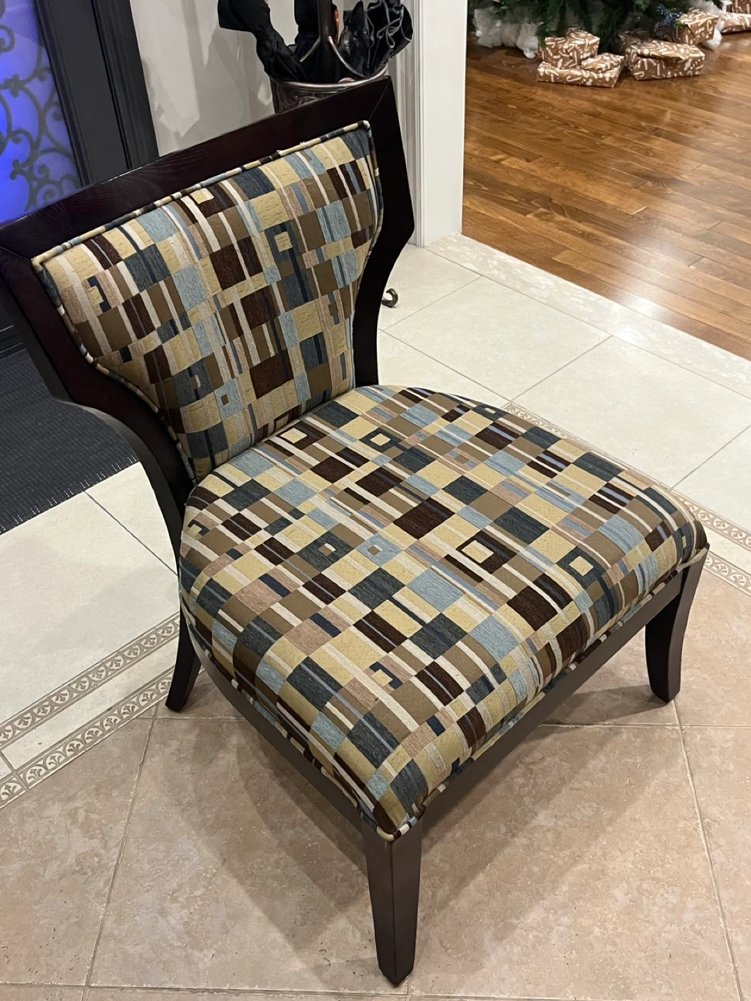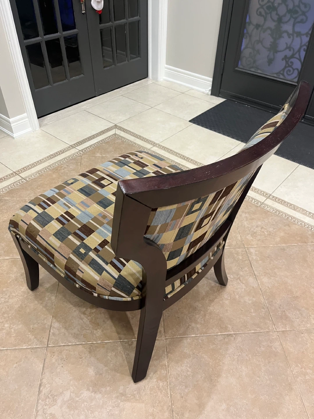 This is a lovely upholstered accent chair with a sturdy wooden frame. The fabric features a geometric pattern in shades of brown, beige, and blue. It would be a great addition to any living room or bedroom!