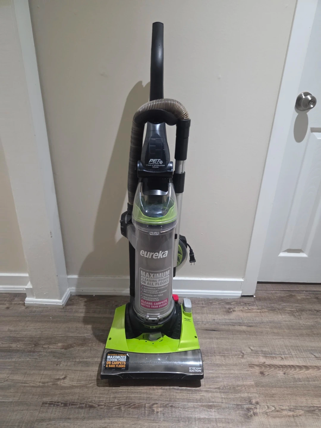 This Eureka vacuum cleaner features maximum cleaning power on all floors. It includes the Pet Power Paw stair and upholstery brush for specialized cleaning. It uses SuctionSeal technology for optimal cleaning on carpets and bare floors.