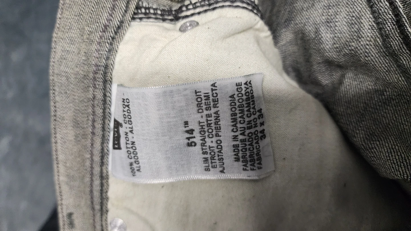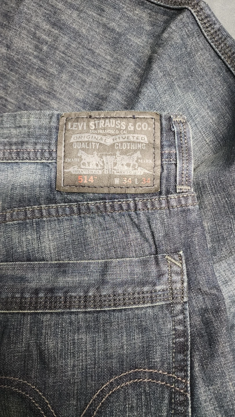 These are Levi's 514 jeans in a slim straight fit. They're made of 100% cotton and are a size 34 waist by 34 inseam. A staple for any wardrobe!
