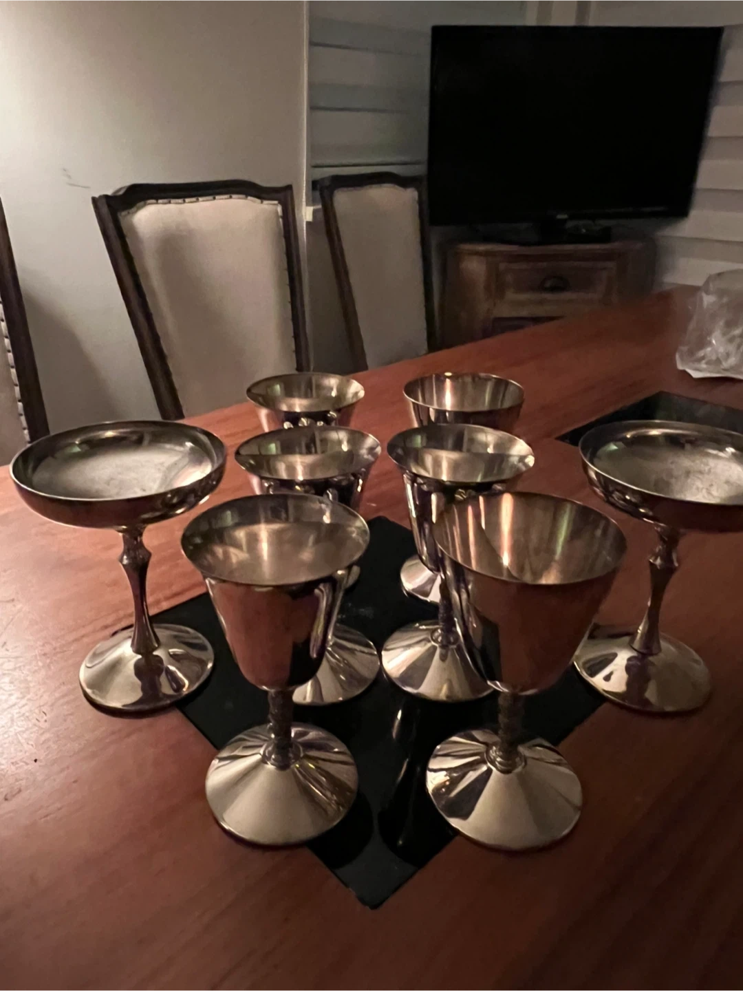 Eight gleaming silver footed goblets are ready for your next gathering. These versatile cups would be perfect for serving individual desserts or as unique drinkware. They're made of metal and have a polished finish.