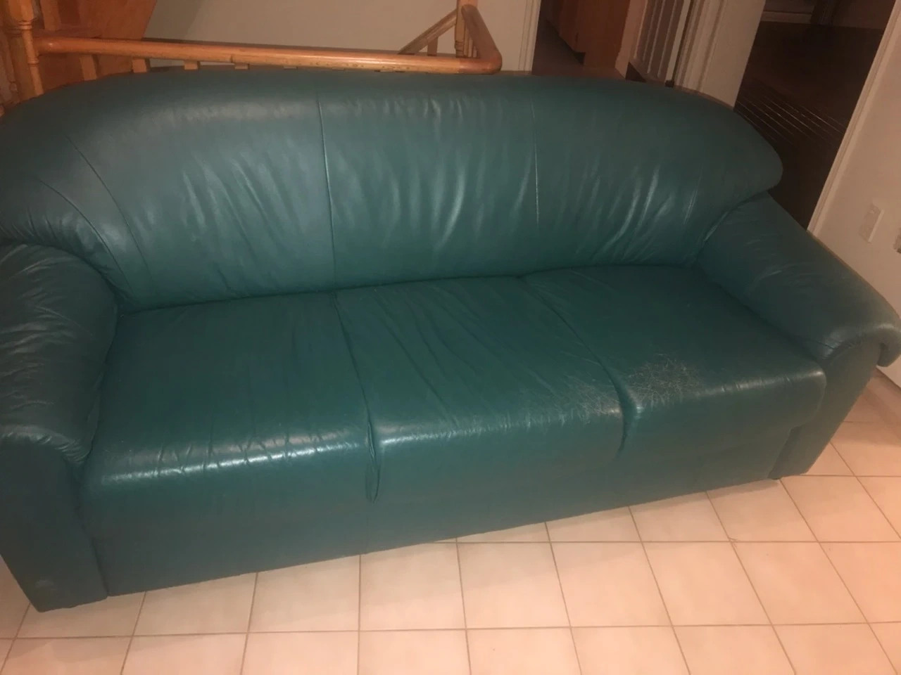 This is a green leather sofa. It has three seat cushions. Some wear is visible on the front cushions.
