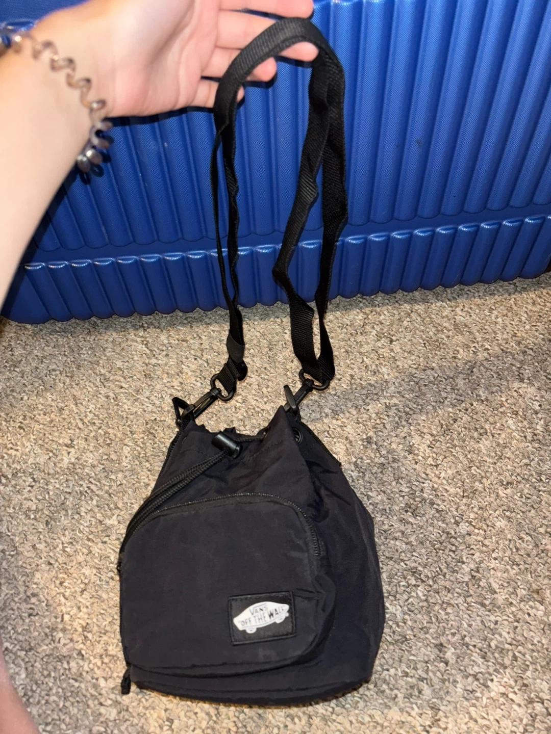 This black Vans bucket bag has a drawstring closure and a front zip pocket. It's made from nylon material and includes a detachable shoulder strap. Great for carrying your essentials!
