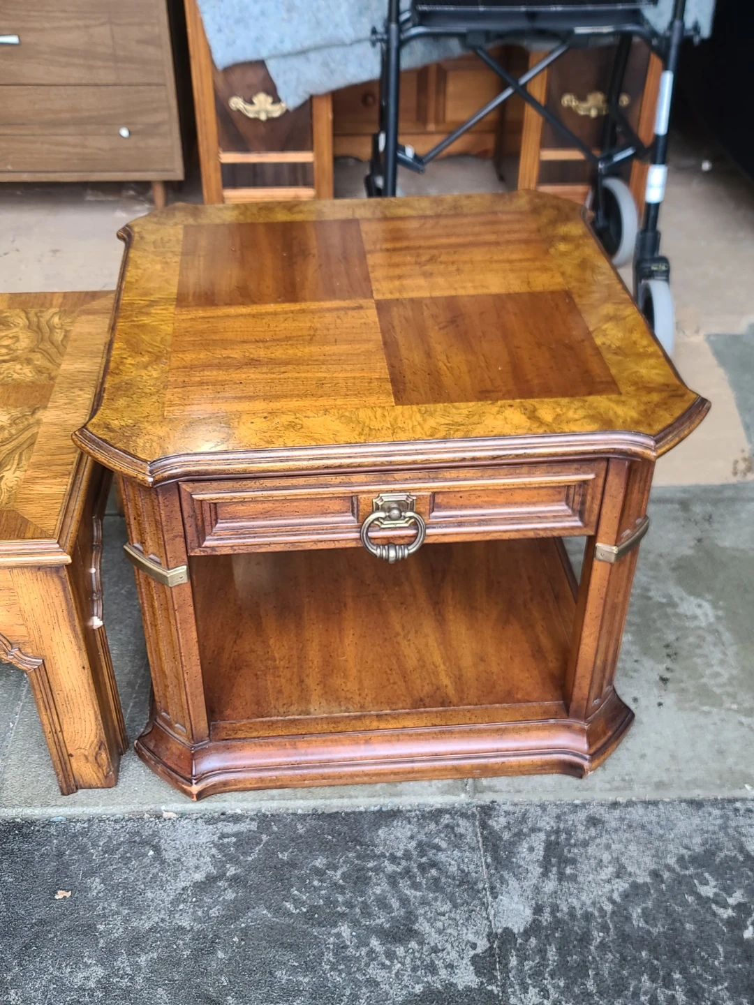 Classic wood coffee table and matching end table set. Coffee table is long and rectangular with a cool patterned wood top. End table is smaller, has a drawer with a ring pull and a lower shelf. Both tables have a similar patterned wood top and decorative legs. Great for a living room. Measurements for table: W 56" X D 24" X H 16". End Table : W 25" X D 24 1/2" X H 21". Delivery can be arranged. Viewing and pickup by appointment.
