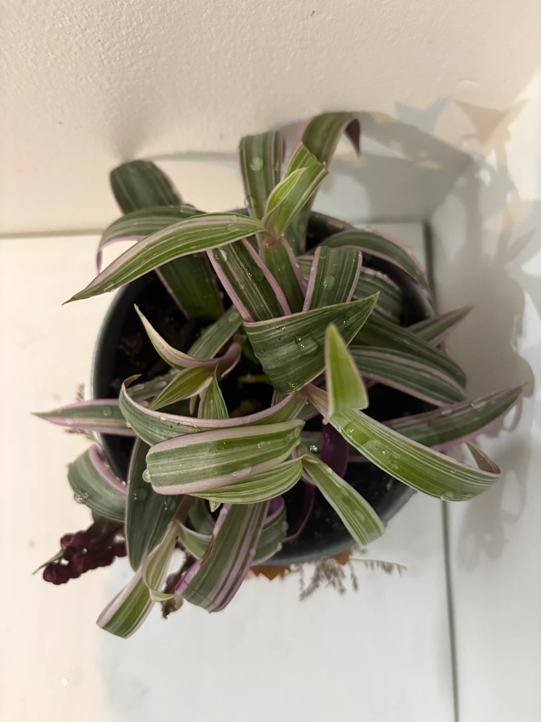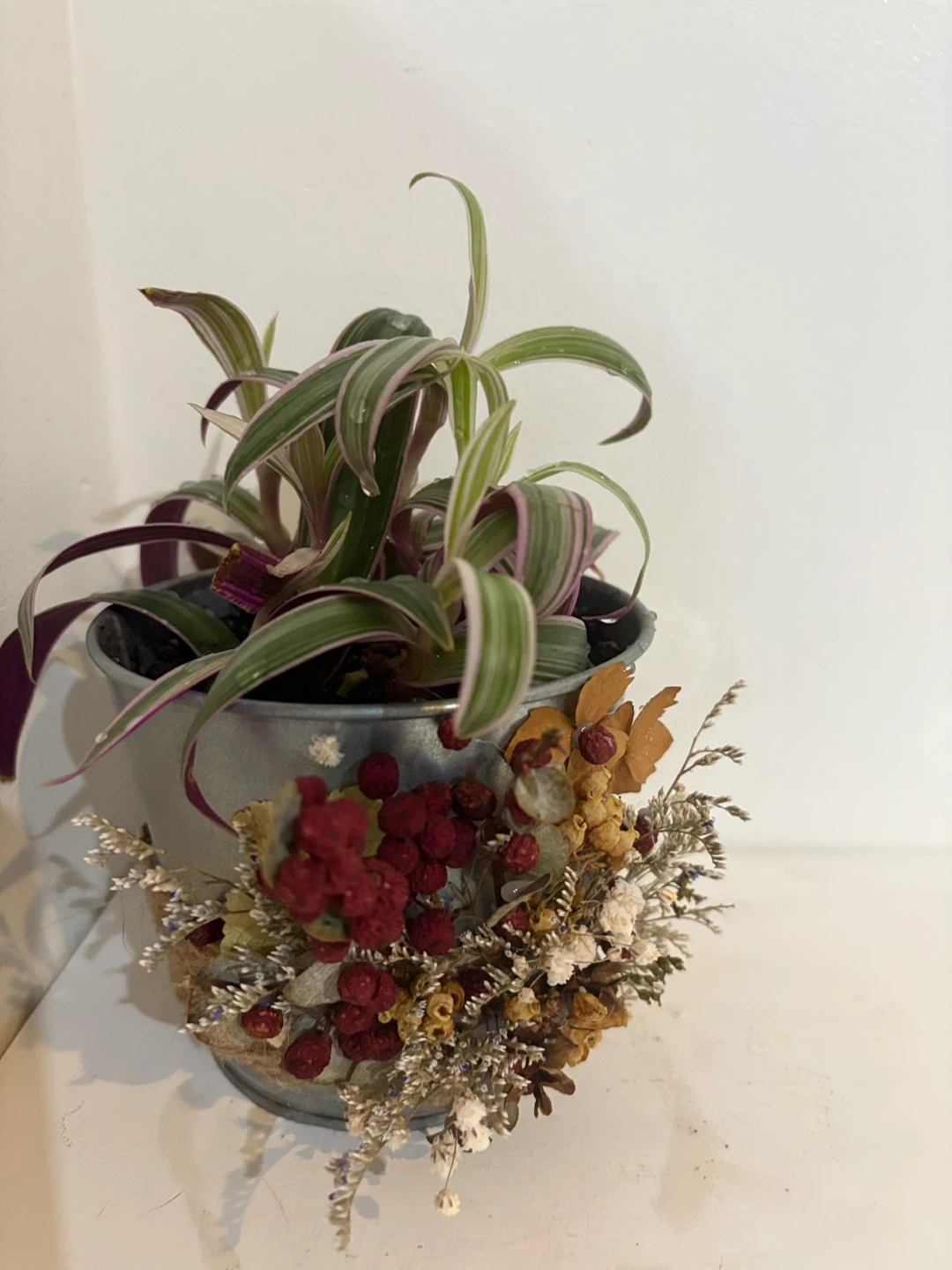 A vibrant Tradescantia Zebrina plant potted in a rustic galvanized metal container. It's decorated with dried floral accents, adding a touch of natural charm. This plant would brighten up any room!