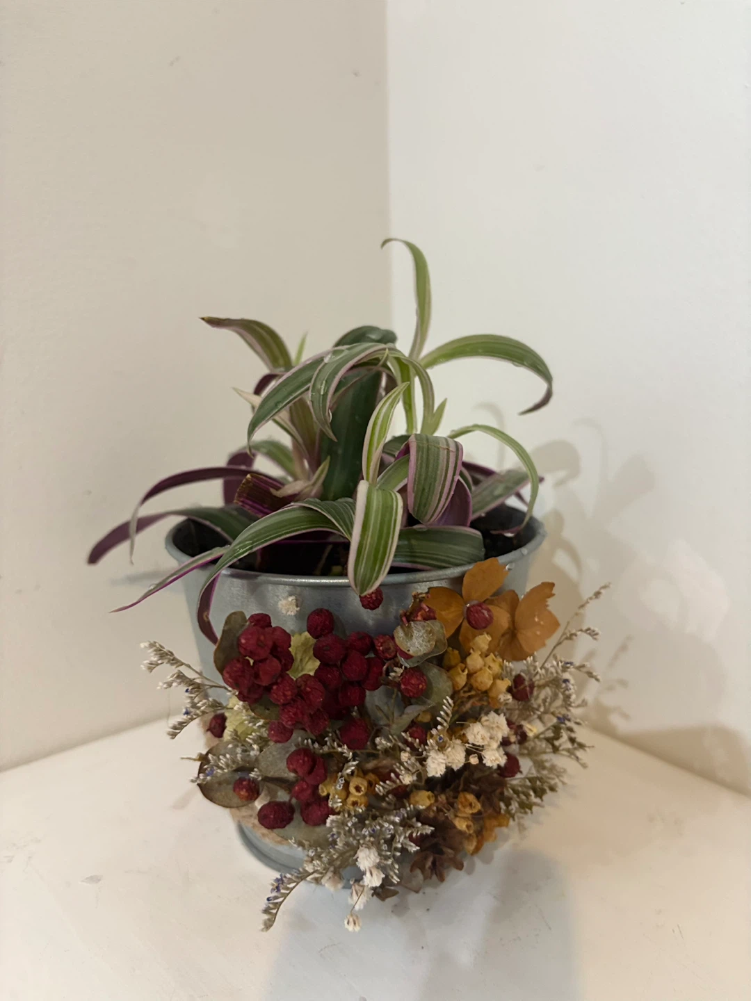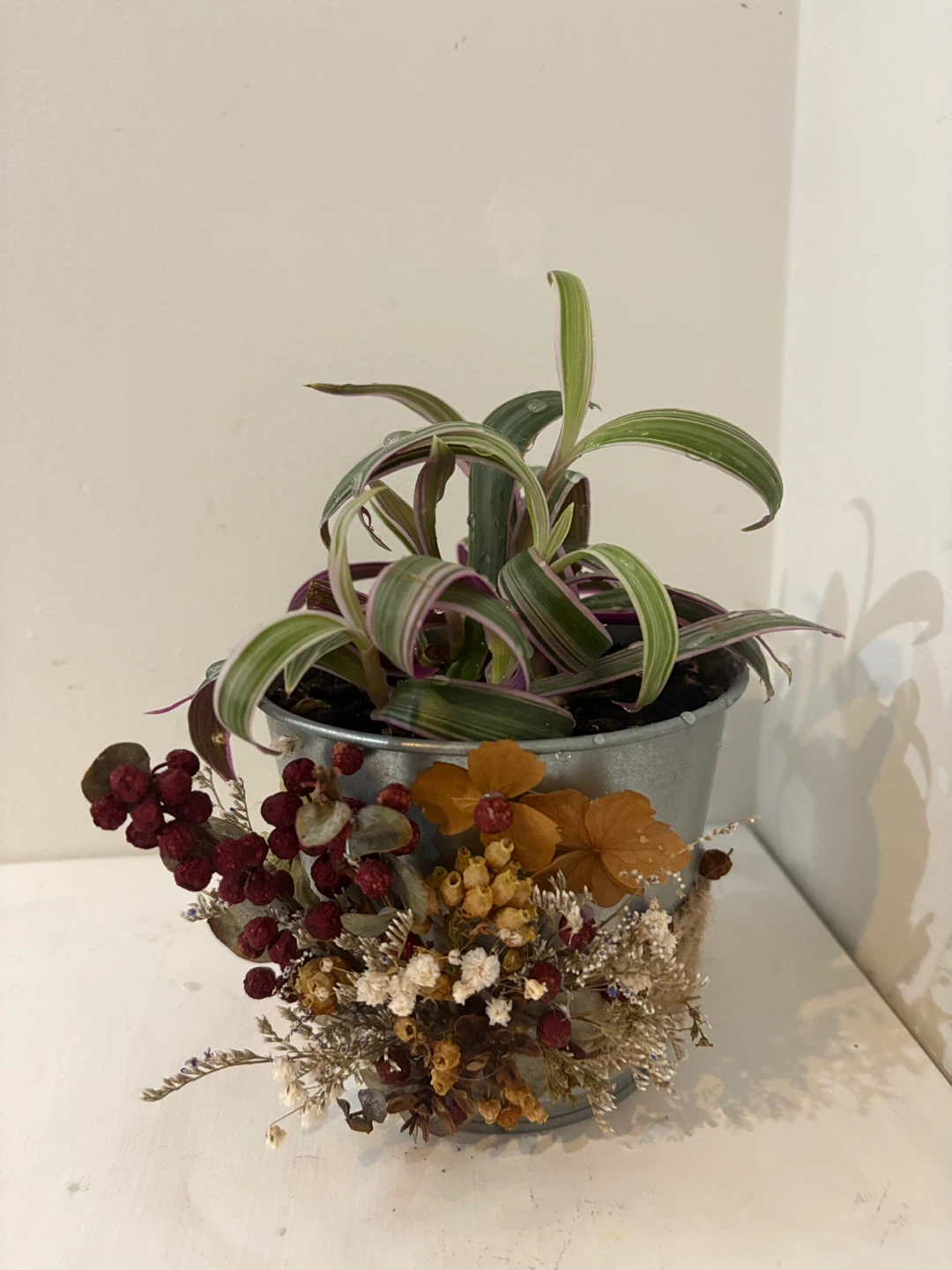 A vibrant Tradescantia Zebrina plant potted in a rustic galvanized metal container. It's decorated with dried floral accents, adding a touch of natural charm. This plant would brighten up any room!