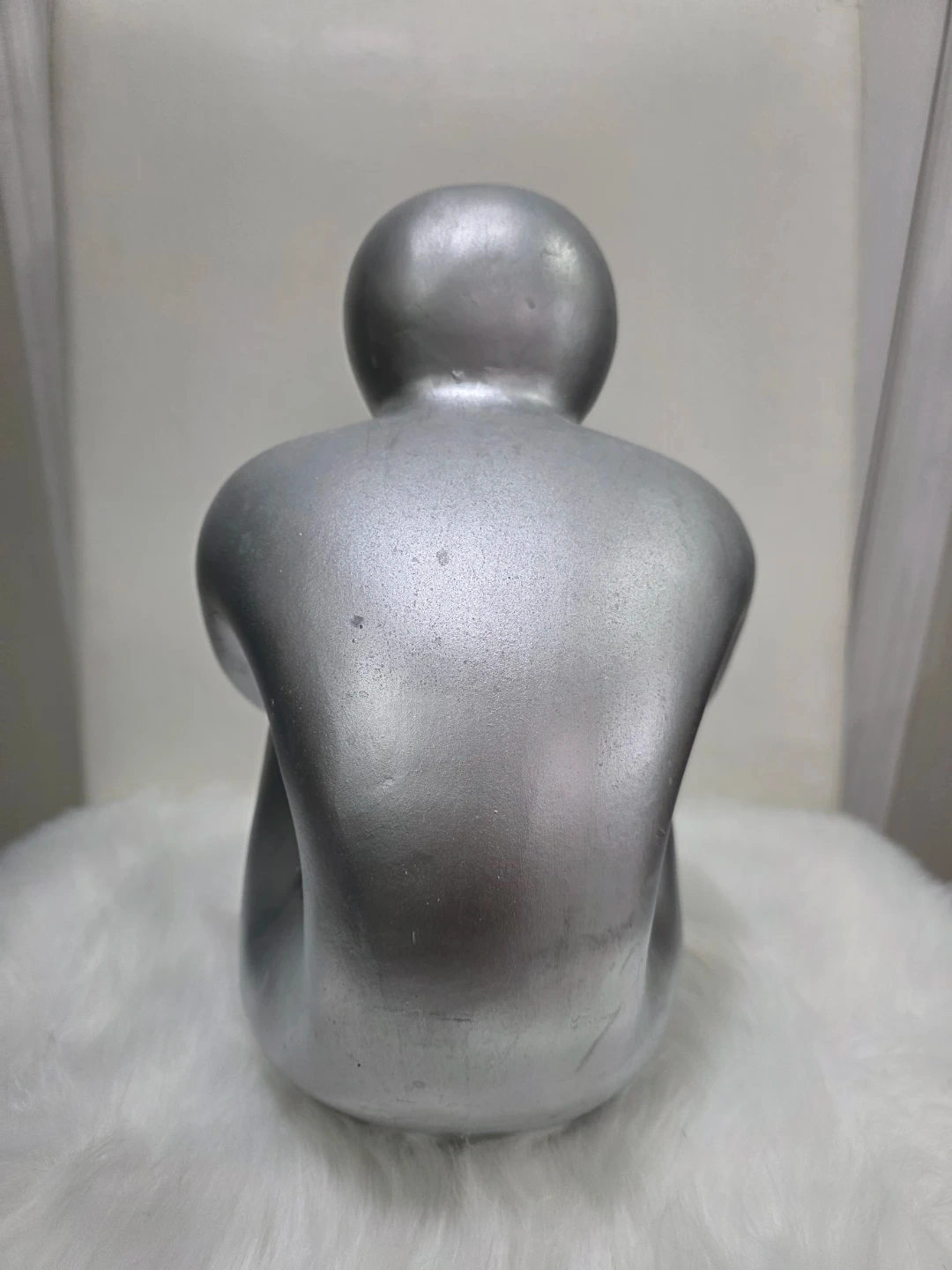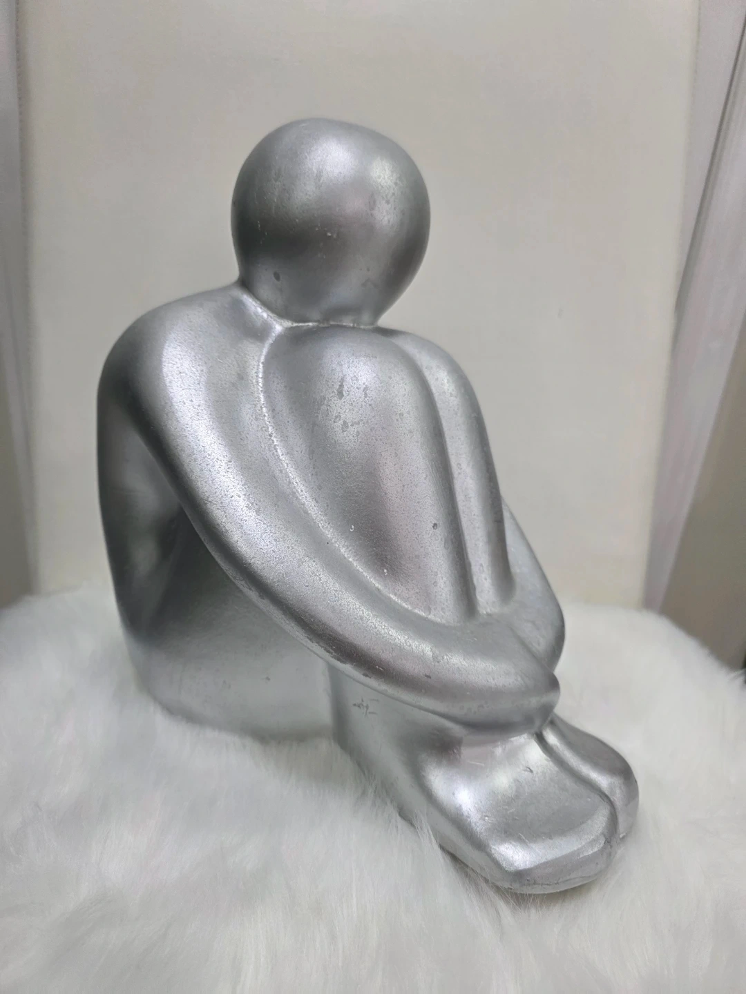 This is a silver abstract sculpture of a seated figure. They would make a nice addition to any room or backyard!