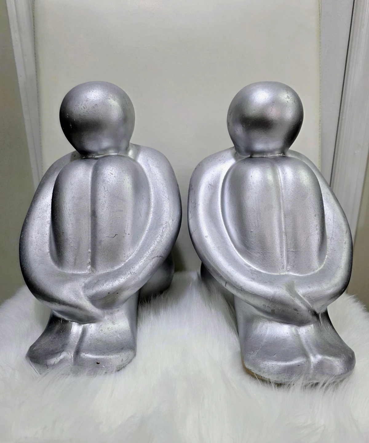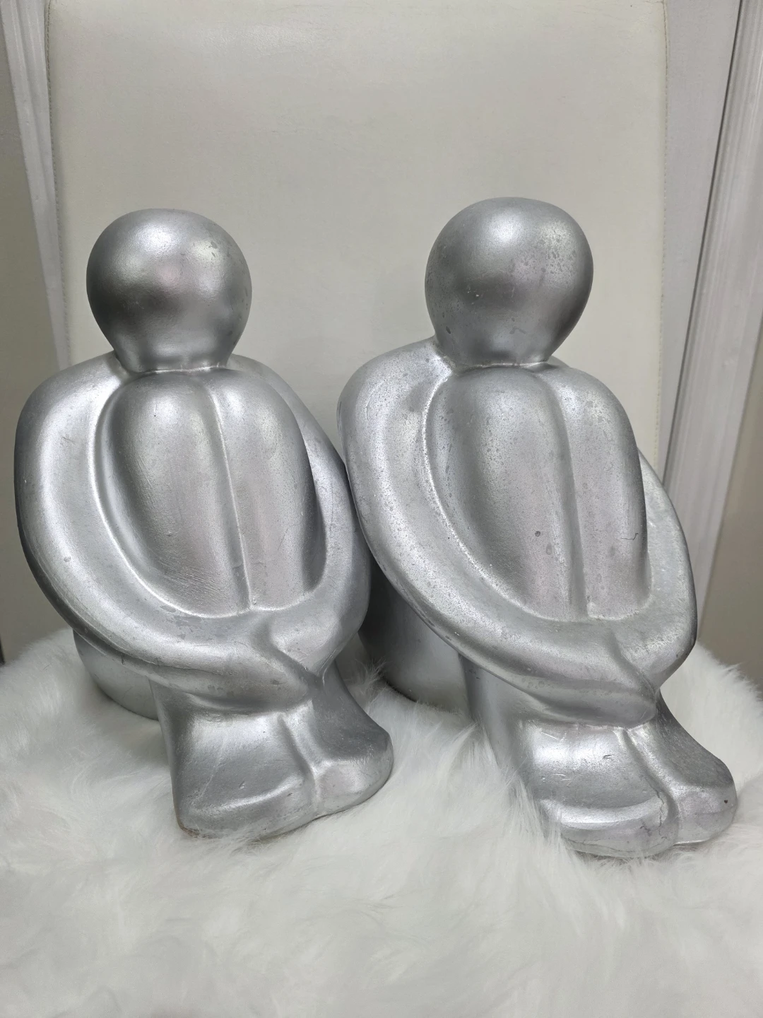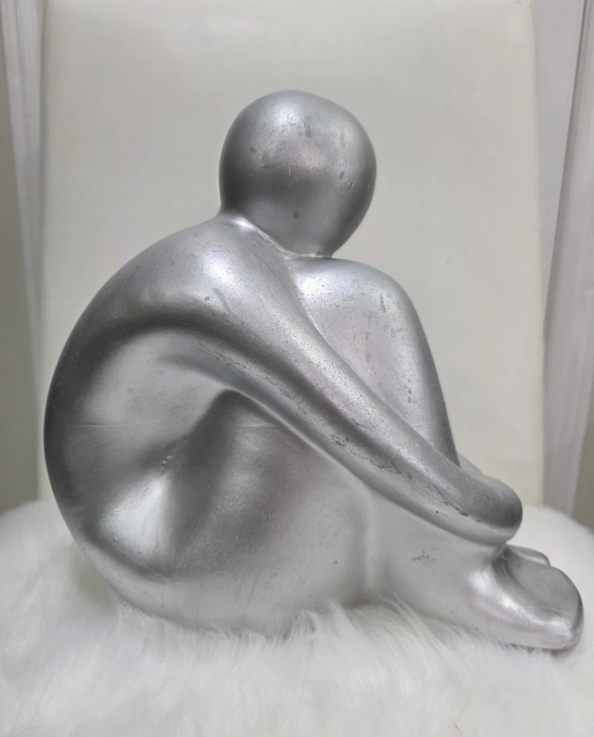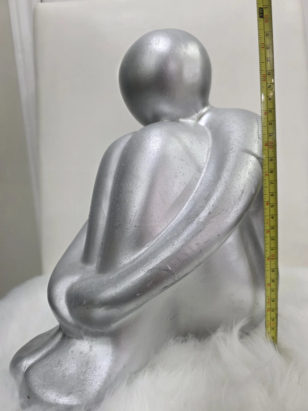 This is a silver abstract sculpture of a seated figure. They would make a nice addition to any room or backyard!