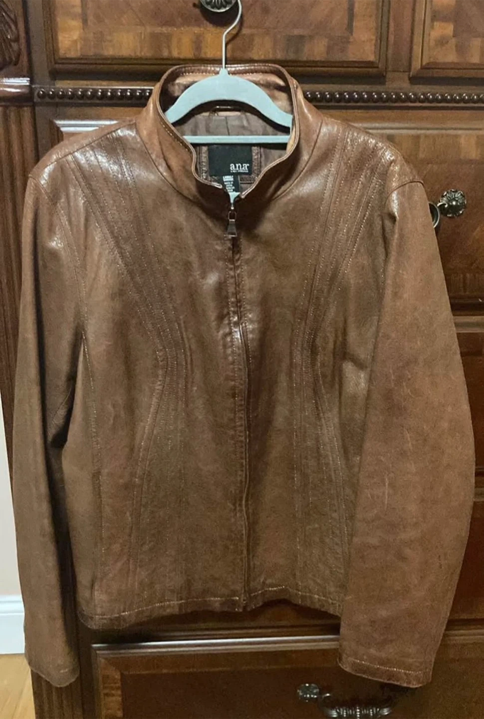 This ANA jacket is made from genuine leather. It's a brown, full-zip style with a stand-up collar. Leather clean only. Size Large .