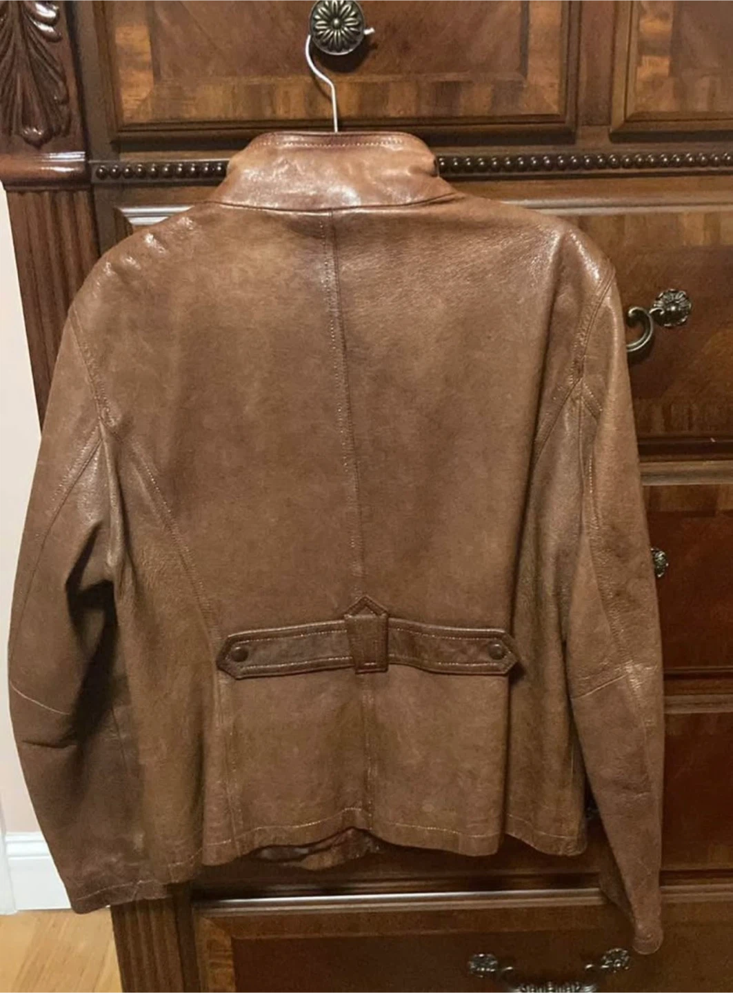 This ANA jacket is made from genuine leather. It's a brown, full-zip style with a stand-up collar. Leather clean only. Size Large .