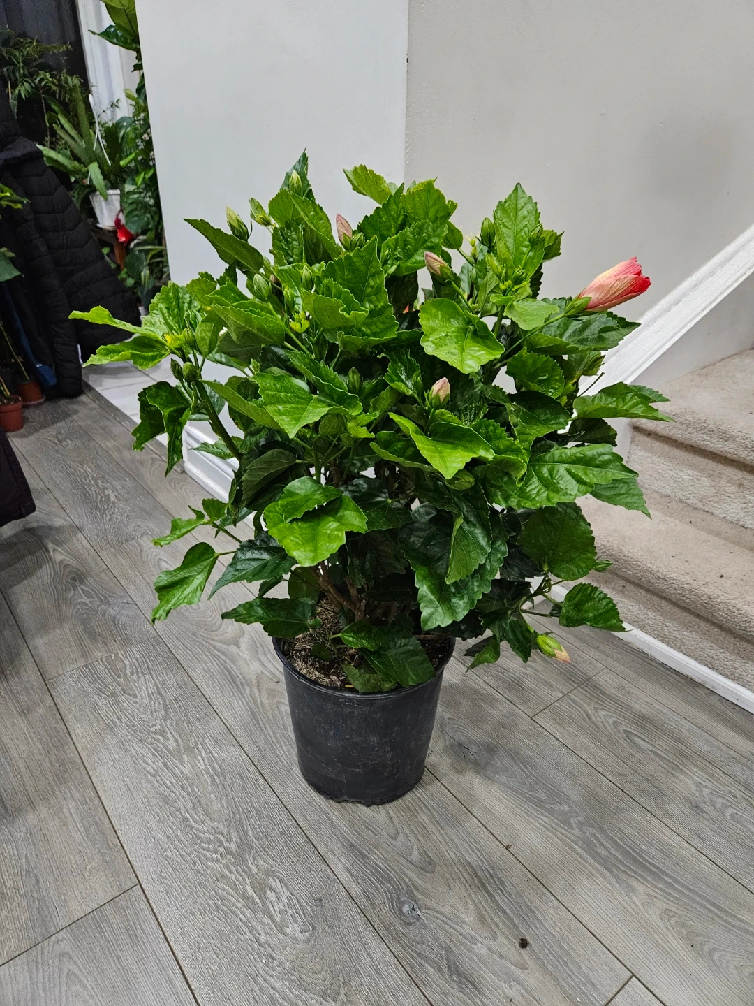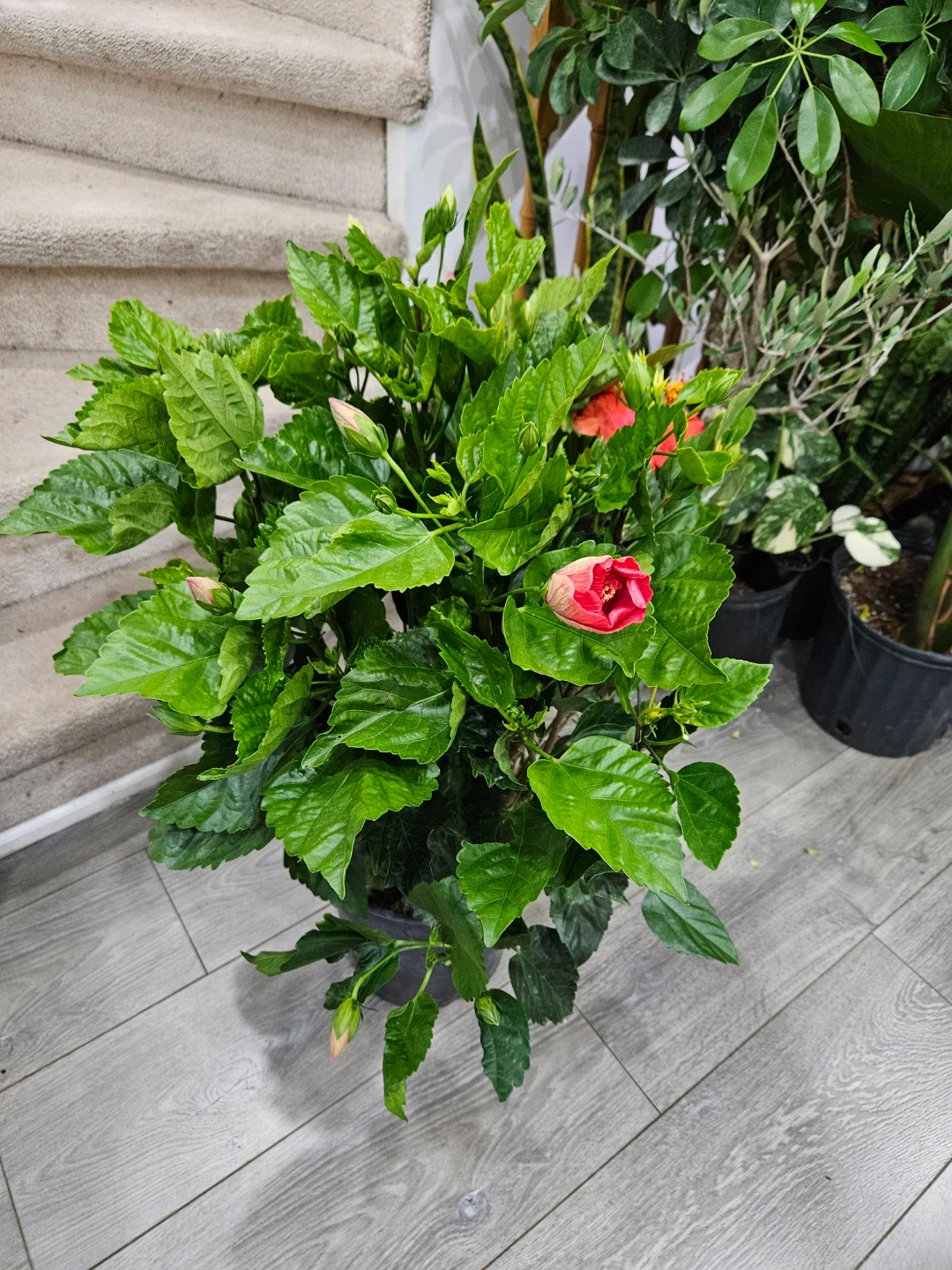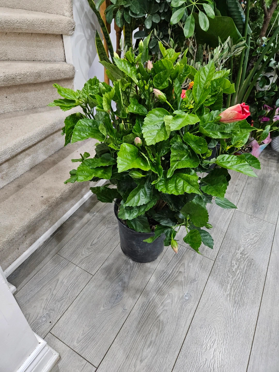 Healthy hibiscus plant potted and ready to bloom. It's currently showing several vibrant flowers and numerous buds. Planted in a standard black pot.
