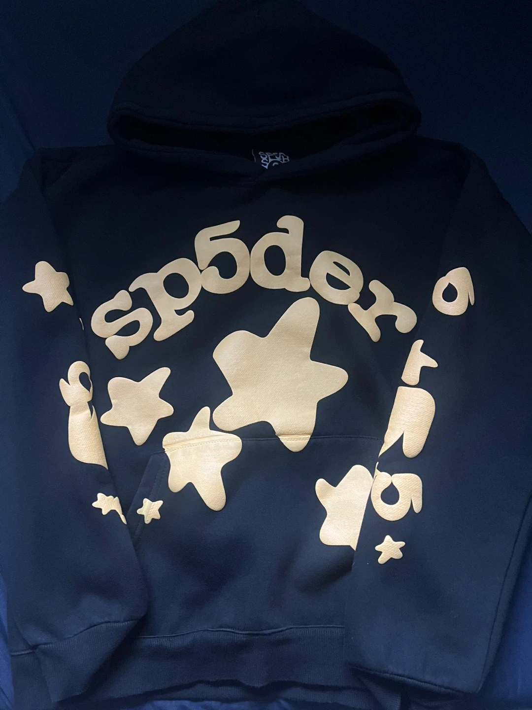 Black SP5DER hoodie featuring a star graphic design. It's a size small. Made with a comfortable fabric blend.