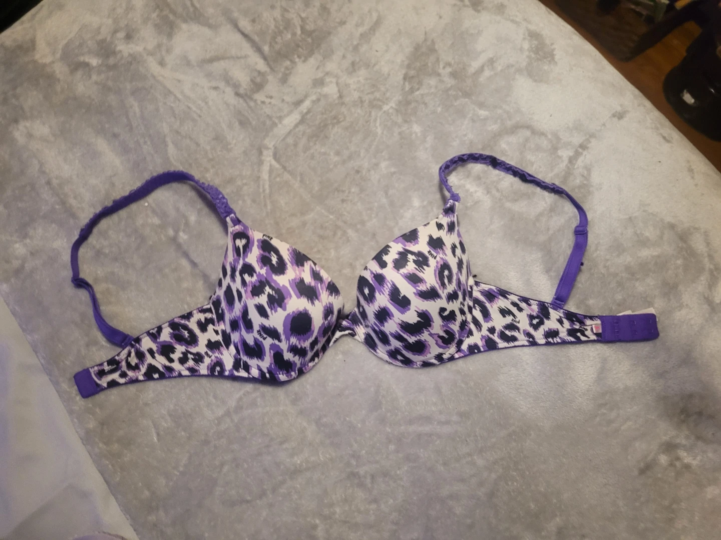Victoria's Secret PINK push-up bra in a purple leopard print. Features adjustable straps and a 32D size. Comfortable and stylish for everyday wear!