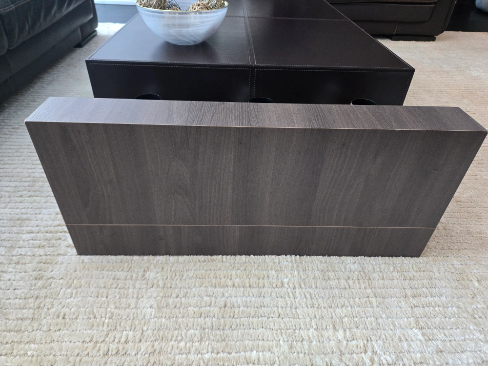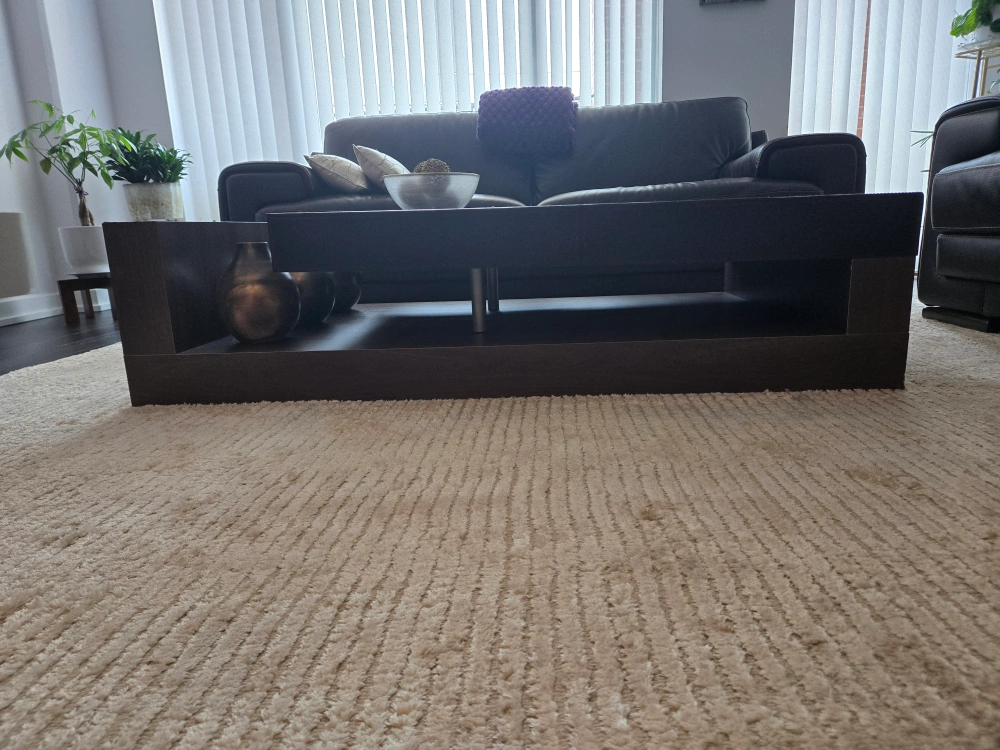 Selling a stylish coffee table with a dark brown leather top and a unique design. It features a wooden base with a built-in display shelf on one side, perfect for showcasing decorative items. The table is in great condition and would be a lovely addition to any living room.