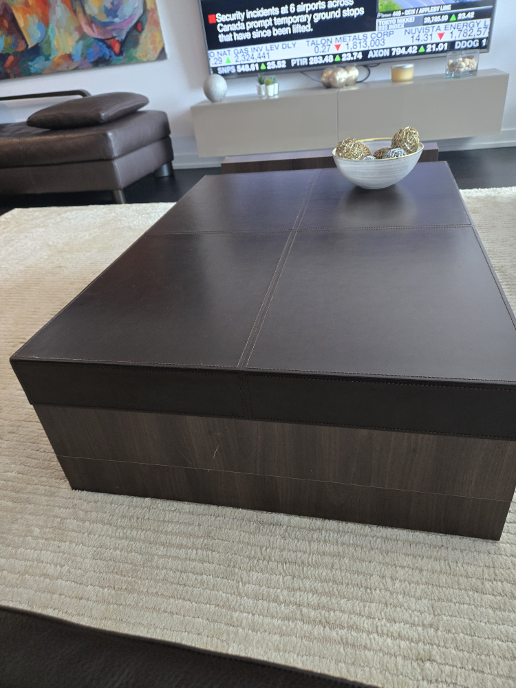 Selling a stylish coffee table with a dark brown leather top and a unique design. It features a wooden base with a built-in display shelf on one side, perfect for showcasing decorative items. The table is in great condition and would be a lovely addition to any living room.