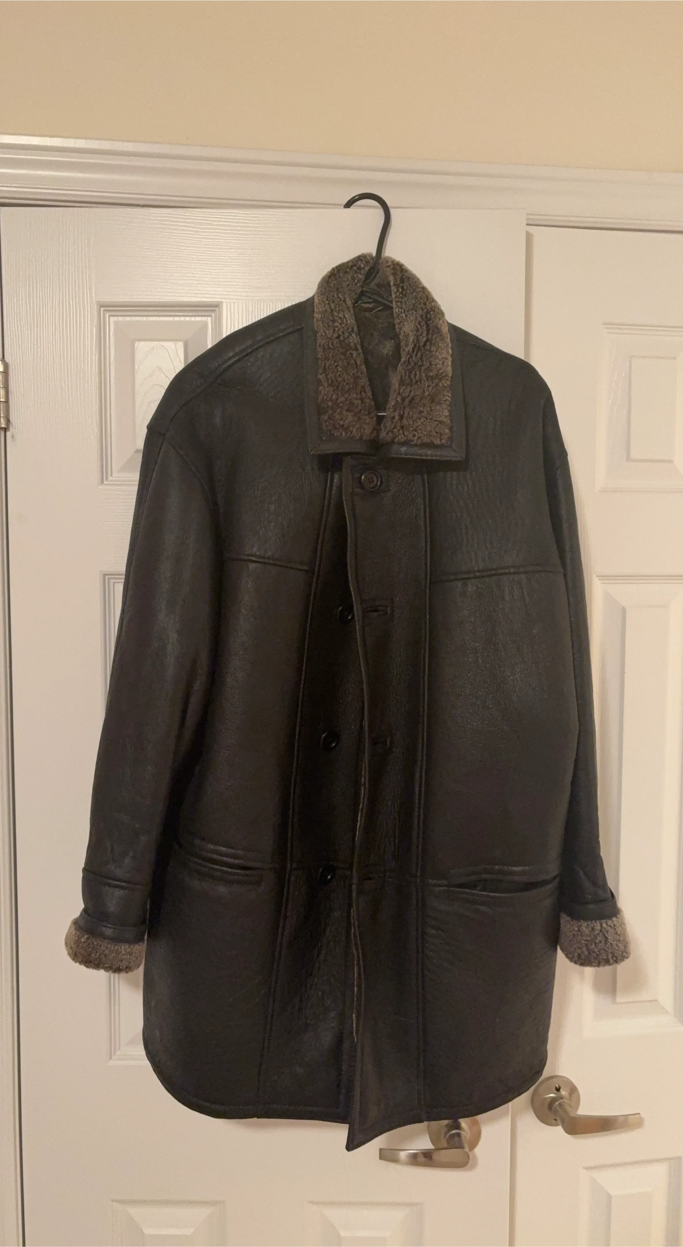This men's jacket is made of dark brown leather with a warm shearling lining. It features a button-up front and two front pockets. The collar and cuffs are also lined with shearling for extra warmth. It's a stylish and practical choice for colder weather!