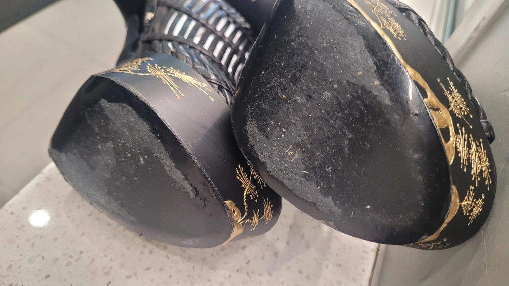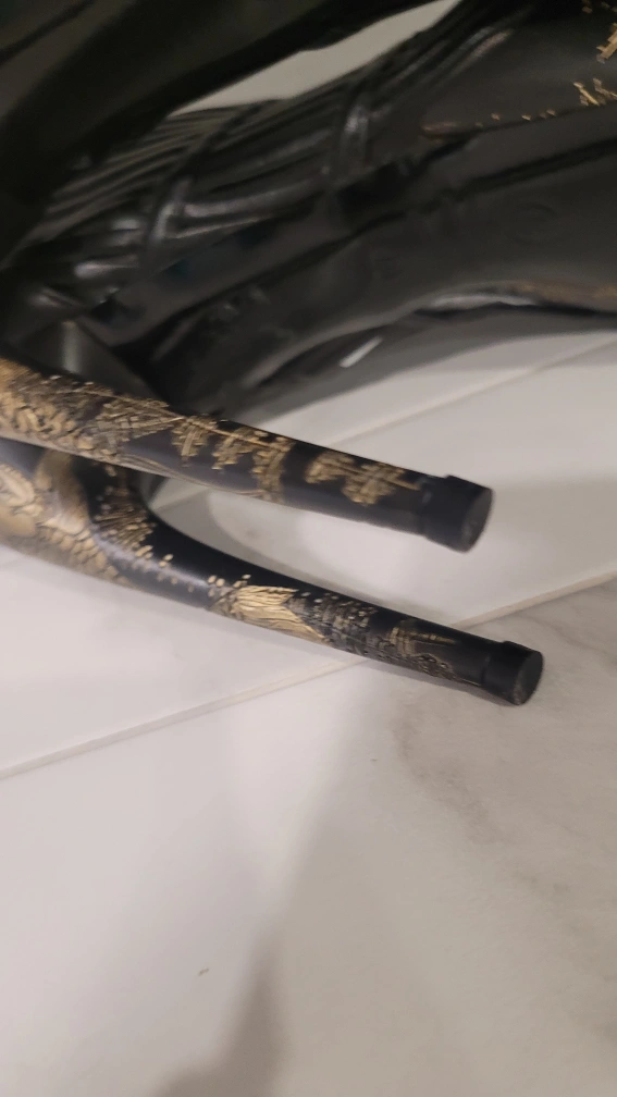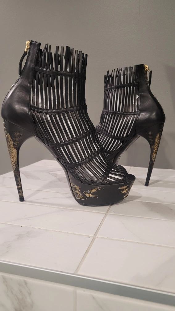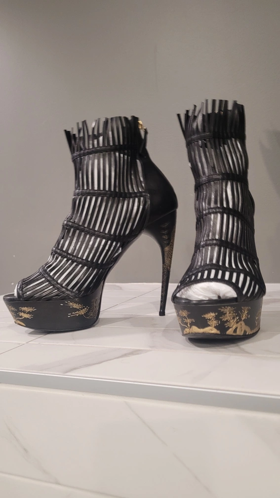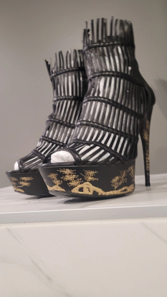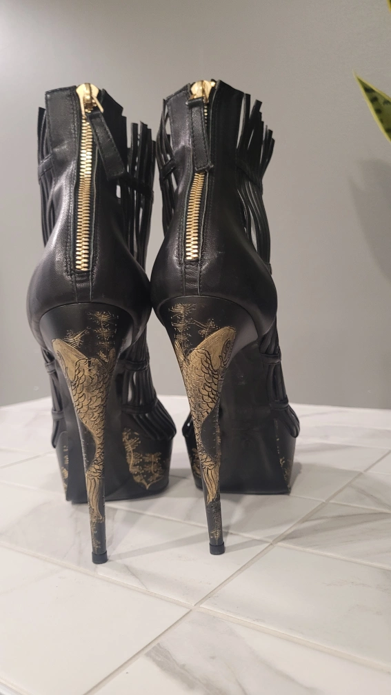 These stylish platform heels are sure to make a statement! They feature a unique design with black and gold detailing. Perfect for a night out or adding a touch of flair to any outfit