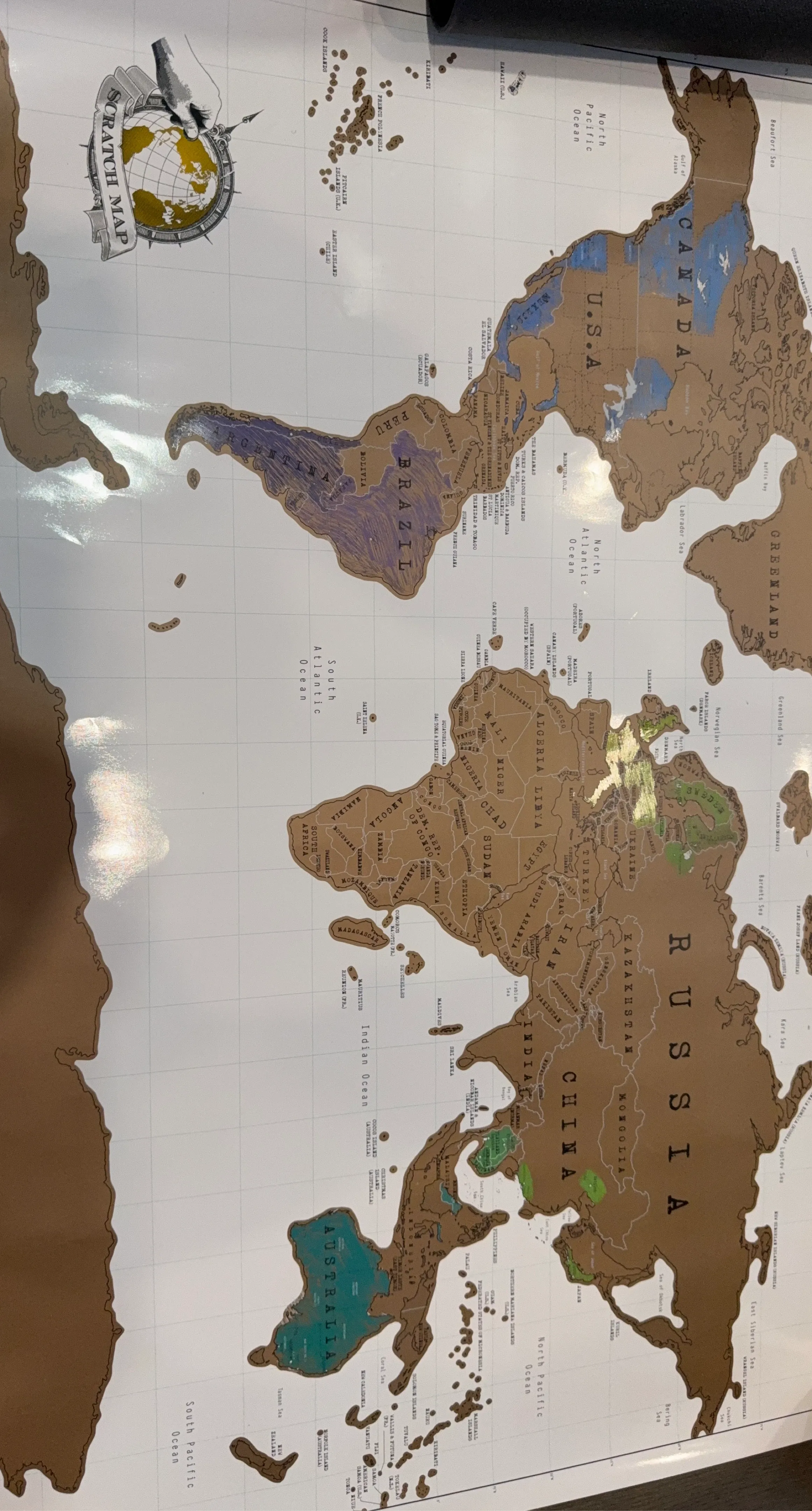 A fun scratch map of the world for tracking your travels. You can scratch off the countries you've visited to reveal vibrant colours underneath. Great for planning your next adventure! Some countries already scratched. Cash and pick up.