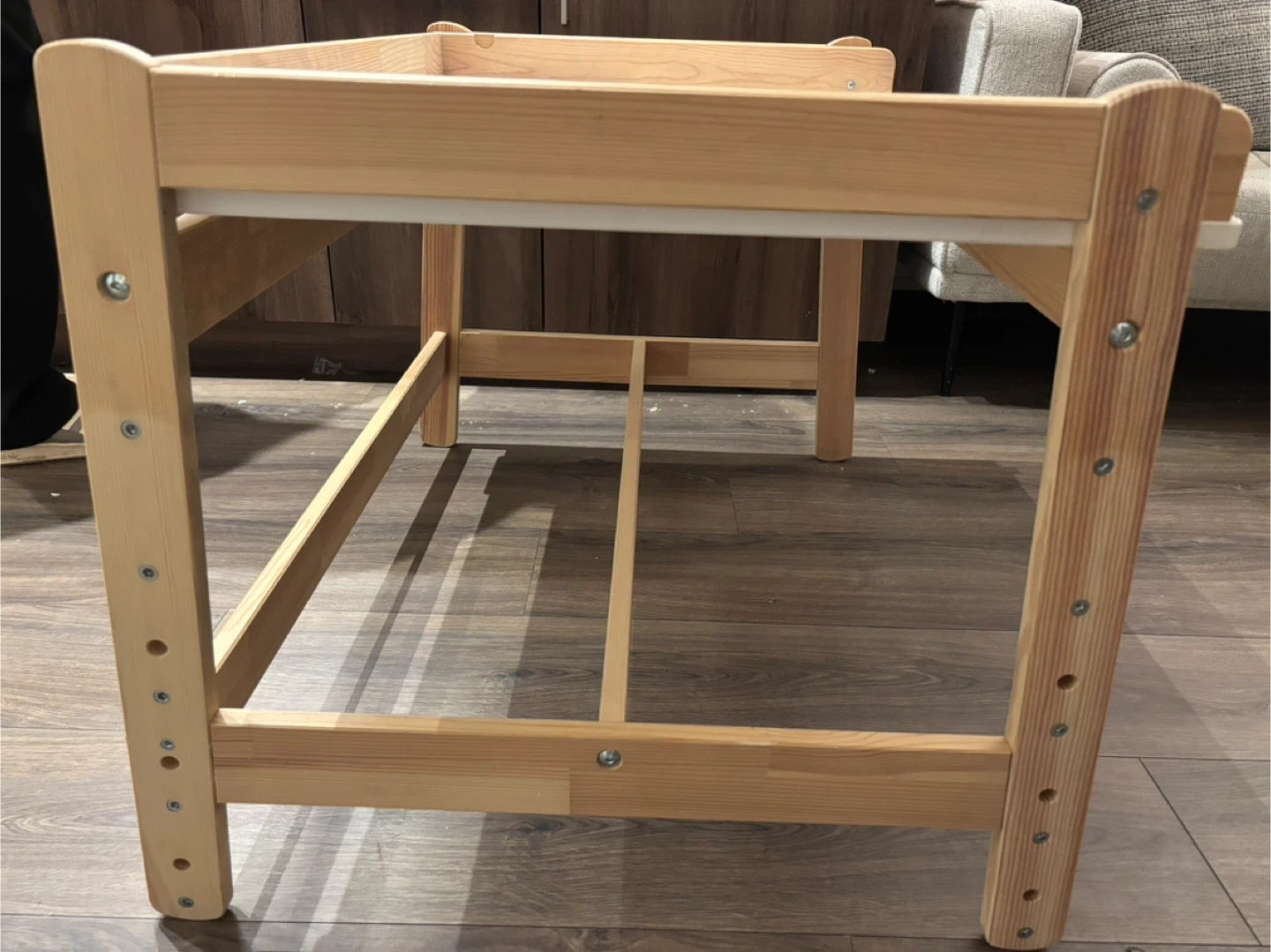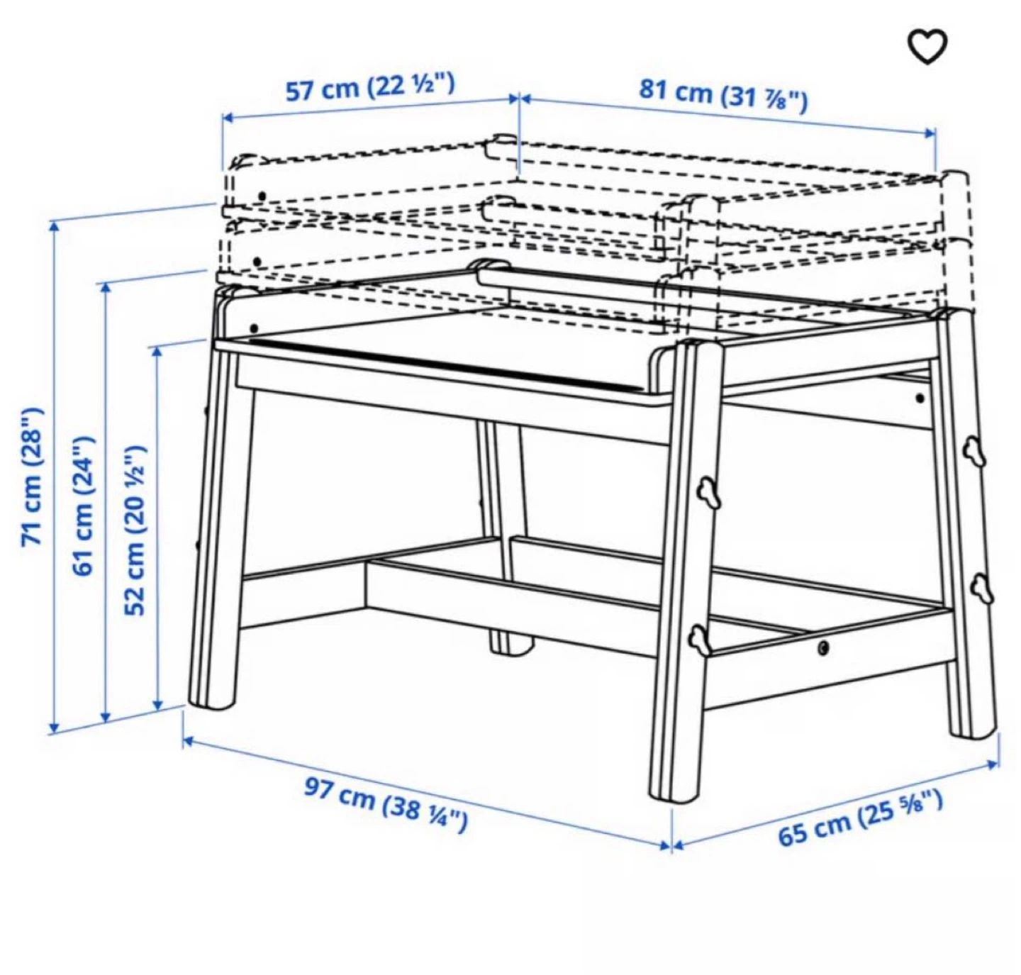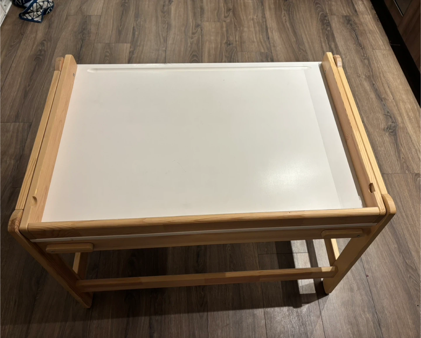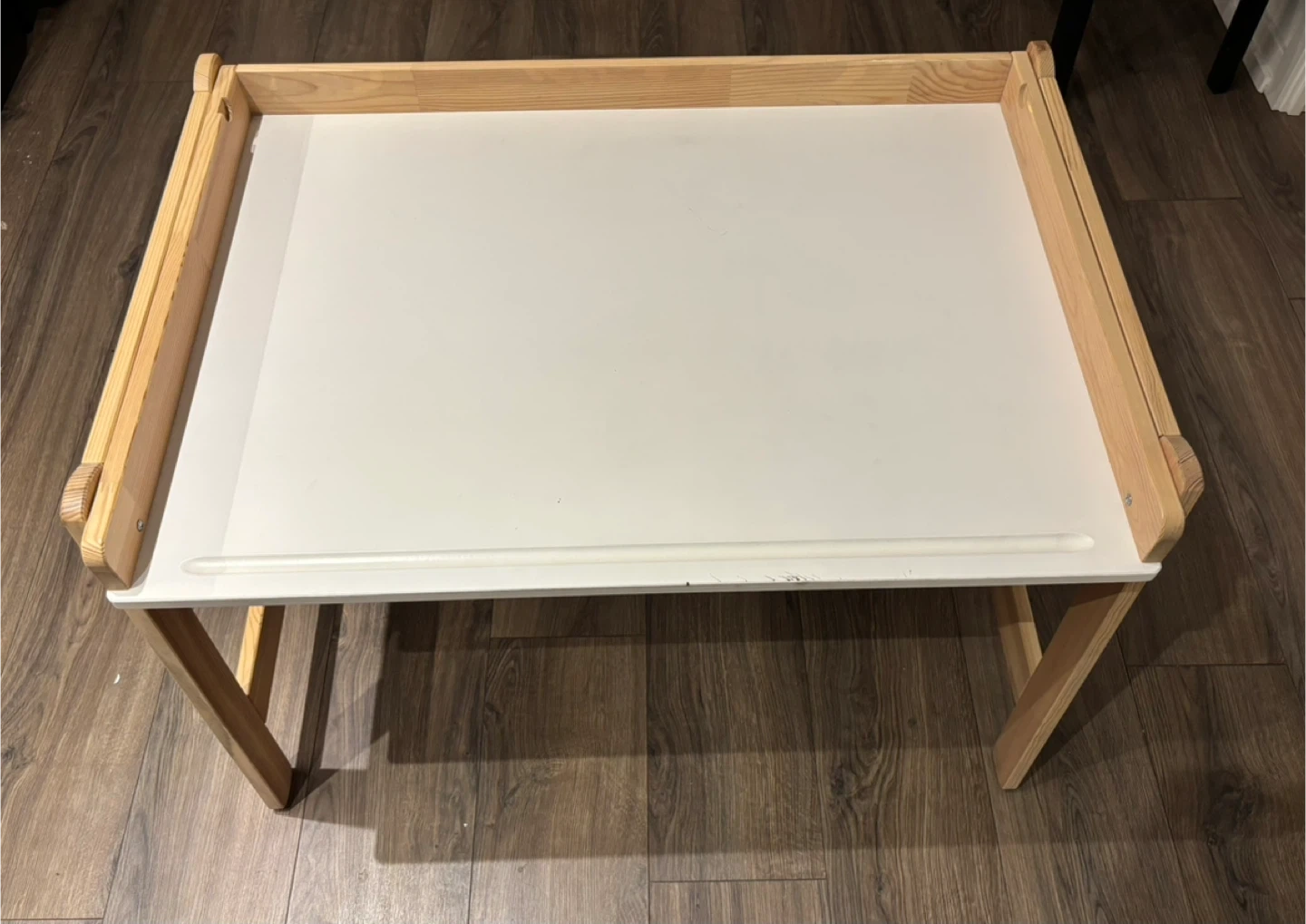 Wooden art easel and table for kids. Includes adjustable height settings. Dimensions: 97 cm wide x 65 cm deep.