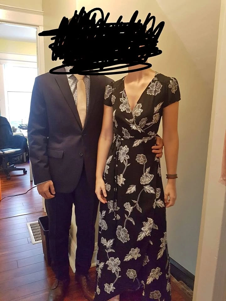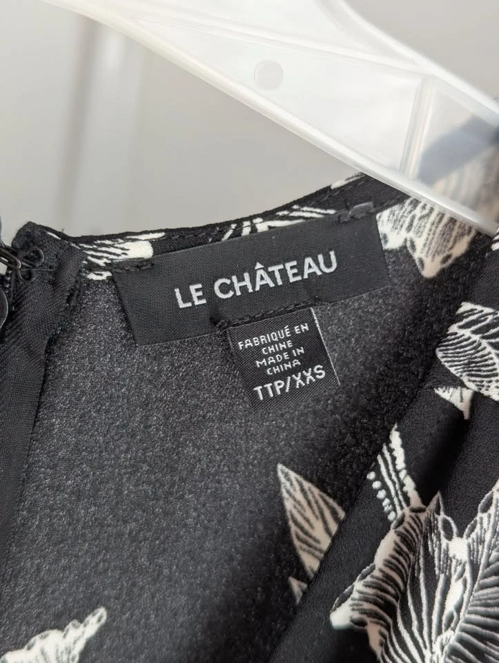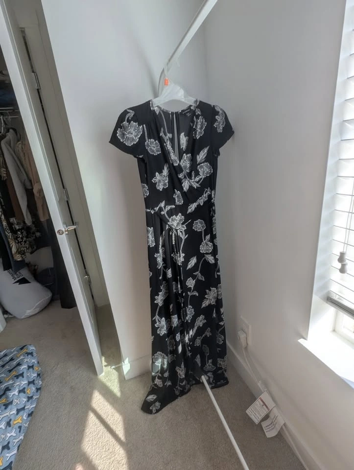 Beautiful black and white floral, floor length dress. The material at the front of the legs overlaps to create a "slit" when walking. Small tie at the waist, but not structural. The material has little stretch, so it fits tight and holds itself in place well! Love this dress, wish it still fit me. Only worn to a couple of weddings. Size XXS, not much stretch. Asking $40 pickup near Langley Costco.