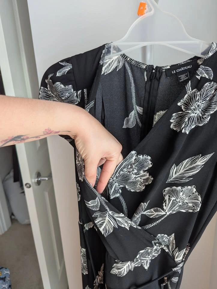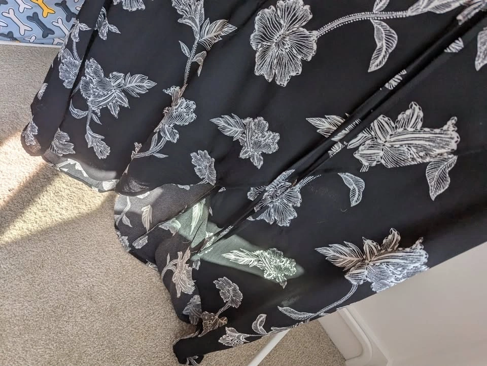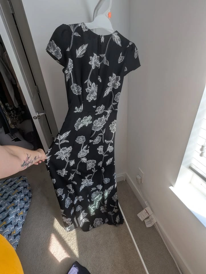 Beautiful black and white floral, floor length dress. The material at the front of the legs overlaps to create a "slit" when walking. Small tie at the waist, but not structural. The material has little stretch, so it fits tight and holds itself in place well! Love this dress, wish it still fit me. Only worn to a couple of weddings. Size XXS, not much stretch. Asking $40 pickup near Langley Costco.